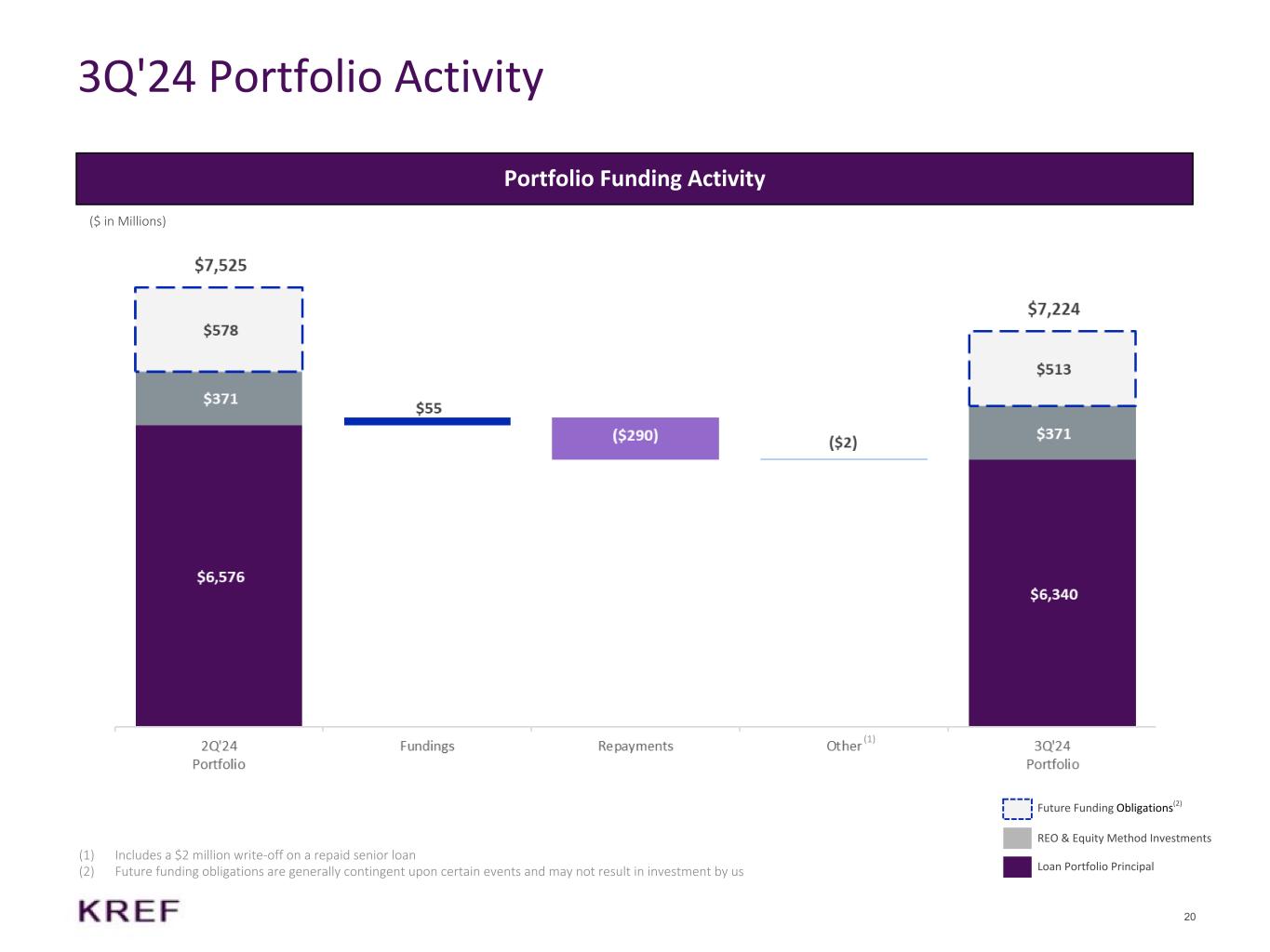 19 3Q'24 Portfolio Details (1) Our total portfolio represents the current principal amount or investment amount on senior and mezzanine loans, real estate assets and other investments. Excludes loans that were fully written off. For Senior Loan 8, the total whole loan is $199.4 million, including (i) a fully funded senior mortgage loan of $120.0 million, at an interest rate of S+2.25% and (ii) a mezzanine note with a commitment of $79.4 million, of which $74.4 million was funded as of September 30, 2024, at a fixed interest rate of 4.5%. The mezzanine note interest is payment-in-kind (“PIK Interest”), which is capitalized, compounded, and added to the outstanding principal balance of the respective loan. For Senior Loan 26, the total whole loan is $110.7 million, including (i) a fully funded senior mortgage loan of $102.0 million, at an interest rate of S+3.06%, (ii) a senior mezzanine note with $7.2 million funded as of September 30, 2024, at a fixed interest rate of 10.0% and (iii) a fully funded junior mezzanine note of $0.8 million, at a fixed interest rate of 10.0% with certain profit share provisions, as defined in the loan agreement. (2) Total Whole Loan represents the total commitment of the entire loan originated, including participations by KKR affiliated entities. (3) Net equity reflects (i) the amortized cost basis of our loans, net of borrowings; (ii) Real Estate Owned ("REO"), net of borrowings and noncontrolling interests, and (iii) the investment amount of equity method investments, net of borrowings. (4) Weighted average is weighted by the current principal amount for our senior and mezzanine loans and by the investment amount of CMBS B-Pieces. Risk-rated 5 loans are excluded from the weighted average LTV. (5) Coupon expressed as spread over Term SOFR. (6) Maximum remaining term (years) assumes all extension options are exercised, if applicable. (7) Loan Per SF / Unit / Key is based on the current principal amount divided by the current SF / Unit / Key. For Senior Loans 2, 3, 5, 16, 20, 22, 56, and 57, Loan Per SF / Unit / Key is calculated as the total commitment amount of the loan divided by the proposed SF / Unit / Key. (8) For senior loans, LTV is generally based on the initial loan amount divided by the as-is appraised value as of the date the loan was originated; for mezzanine loans, LTV is based on the initial balance of the whole loan divided by the as-is appraised value as of the date the loan was originated; for CMBS B-Pieces, LTV is based on the weighted average LTV of the underlying loan pool at issuance. Weighted Average LTV excludes risk-rated 5 loans. For Senior Loans 2, 3, 5, 16, 20, 22, 56, and 57, LTV is calculated as the total commitment amount of the loan divided by the as-stabilized value as of the date the loan was originated. For senior loans where an appraisal has been obtained post origination, the LTV, presented as follows, is calculated based on the current principal amount divided by the as-is appraised value as of the new appraisal date: Senior Loan 15 (64%); Senior Loan 18 (64%); Senior Loan 19 (78%); Senior Loan 23 (64%); Senior Loan 27 (57%); Senior Loan 28 (75%); Senior Loan 31 (83%); Senior Loan 33 (70%), Senior Loan 38 (63%); Senior Loan 42 (81%); and Senior Loan 57 (61%). (9) Represents real estate assets held through a Tenant-in-Common ("TIC") agreement between us and a KKR affiliate. We hold a 74.6% economic interest in the real estate assets and share decision- making with the KKR affiliate under the TIC agreement. (10) Represents our investment in an aggregator vehicle that invests in CMBS B-Pieces. Committed principal represents our total commitment to the aggregator vehicle whereas current principal represents the current funded amount.
