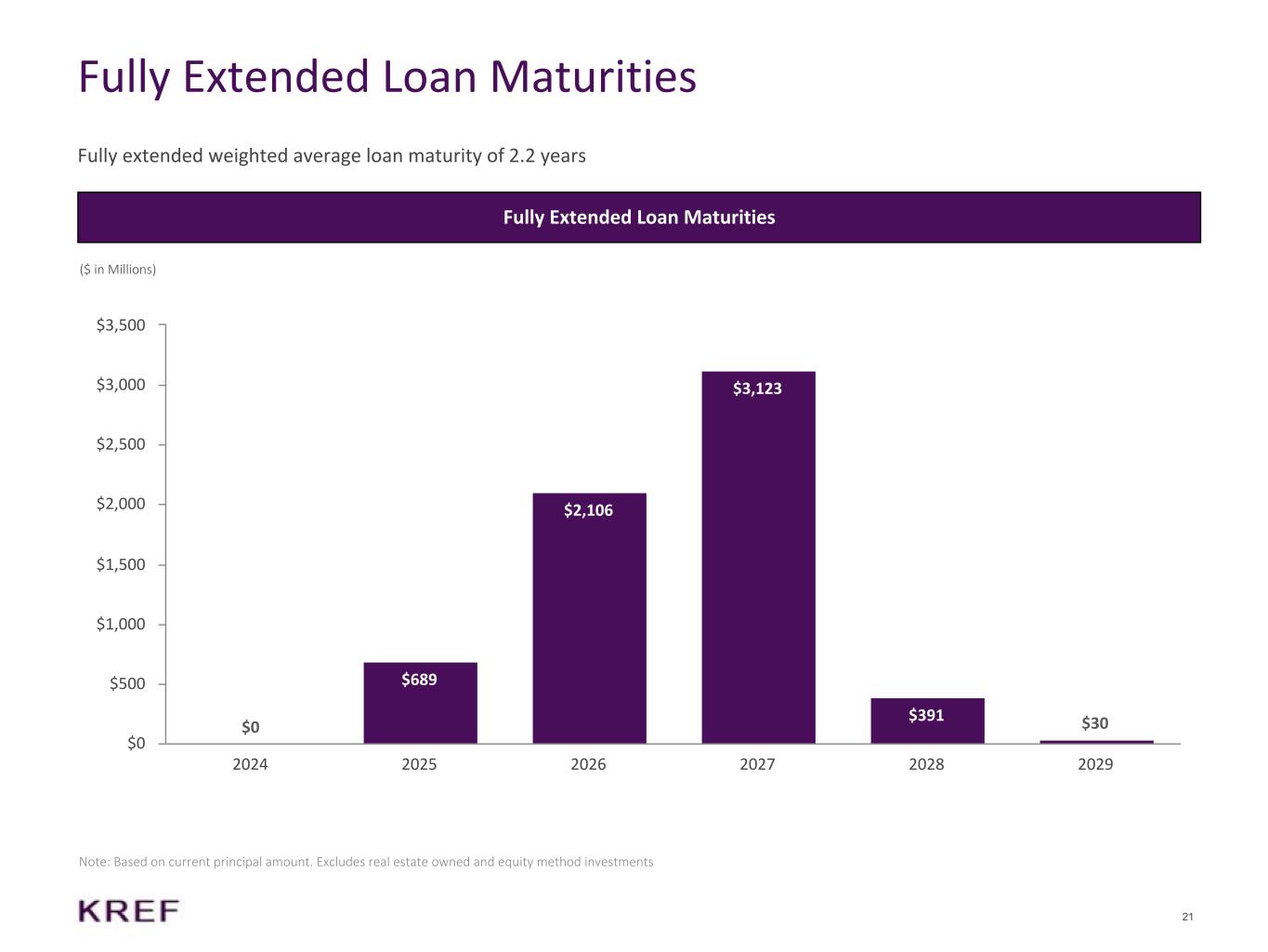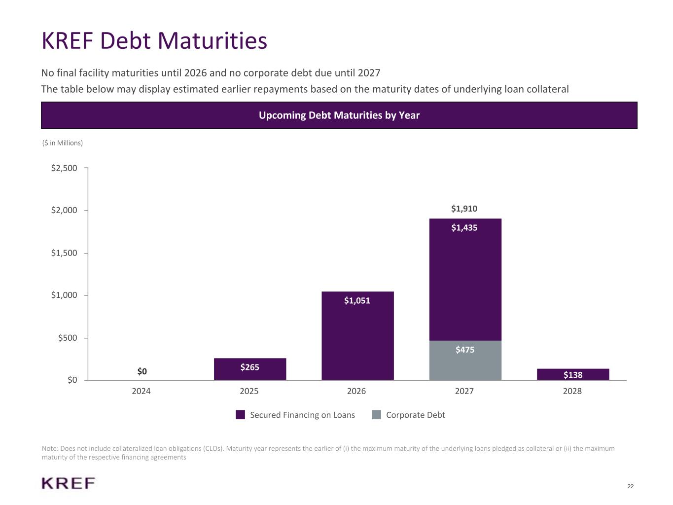 22 KREF Debt Maturities Note: Does not include collateralized loan obligations (CLOs). Maturity year represents the earlier of (i) the maximum maturity of the underlying loans pledged as collateral or (ii) the maximum maturity of the respective financing agreements Upcoming Debt Maturities by Year ($ in Millions) $475 $0 $265 $1,051 $1,435 $138 Secured Financing on Loans Corporate Debt 2024 2025 2026 2027 2028 $0 $500 $1,000 $1,500 $2,000 $2,500 No final facility maturities until 2026 and no corporate debt due until 2027 The table below may display estimated earlier repayments based on the maturity dates of underlying loan collateral $1,910