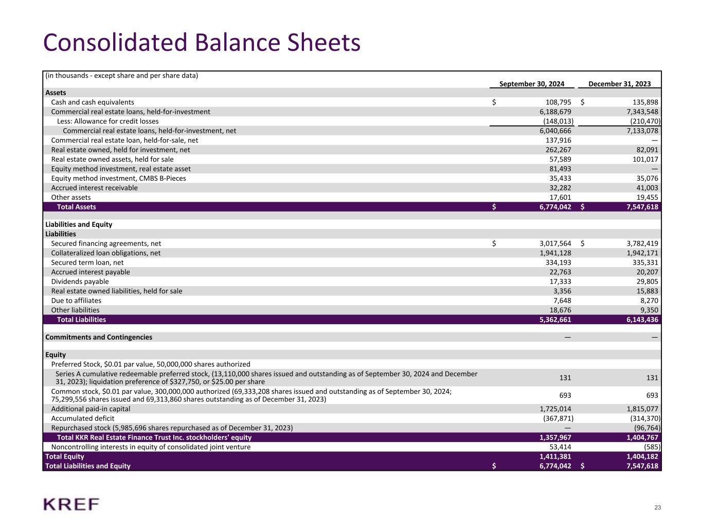 23 Consolidated Balance Sheets (in thousands - except share and per share data) September 30, 2024 December 31, 2023 Assets Cash and cash equivalents $ 108,795 $ 135,898 Commercial real estate loans, held-for-investment 6,188,679 7,343,548 Less: Allowance for credit losses (148,013) (210,470) Commercial real estate loans, held-for-investment, net 6,040,666 7,133,078 Commercial real estate loan, held-for-sale, net 137,916 — Real estate owned, held for investment, net 262,267 82,091 Real estate owned assets, held for sale 57,589 101,017 Equity method investment, real estate asset 81,493 — Equity method investment, CMBS B-Pieces 35,433 35,076 Accrued interest receivable 32,282 41,003 Other assets 17,601 19,455 Total Assets $ 6,774,042 $ 7,547,618 Liabilities and Equity Liabilities Secured financing agreements, net $ 3,017,564 $ 3,782,419 Collateralized loan obligations, net 1,941,128 1,942,171 Secured term loan, net 334,193 335,331 Accrued interest payable 22,763 20,207 Dividends payable 17,333 29,805 Real estate owned liabilities, held for sale 3,356 15,883 Due to affiliates 7,648 8,270 Other liabilities 18,676 9,350 Total Liabilities 5,362,661 6,143,436 Commitments and Contingencies — — Equity Preferred Stock, $0.01 par value, 50,000,000 shares authorized Series A cumulative redeemable preferred stock, (13,110,000 shares issued and outstanding as of September 30, 2024 and December 31, 2023); liquidation preference of $327,750, or $25.00 per share 131 131 Common stock, $0.01 par value, 300,000,000 authorized (69,333,208 shares issued and outstanding as of September 30, 2024; 75,299,556 shares issued and 69,313,860 shares outstanding as of December 31, 2023) 693 693 Additional paid-in capital 1,725,014 1,815,077 Accumulated deficit (367,871) (314,370) Repurchased stock (5,985,696 shares repurchased as of December 31, 2023) — (96,764) Total KKR Real Estate Finance Trust Inc. stockholders' equity 1,357,967 1,404,767 Noncontrolling interests in equity of consolidated joint venture 53,414 (585) Total Equity 1,411,381 1,404,182 Total Liabilities and Equity $ 6,774,042 $ 7,547,618