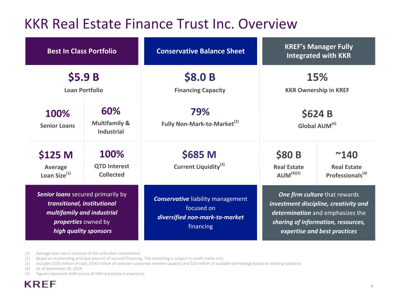 2 Legal Disclosures This presentation has been prepared for KKR Real Estate Finance Trust Inc. (NYSE: KREF) for the benefit of its stockholders. This presentation is solely for informational purposes in connection with evaluating the business, operations and financial results of KKR Real Estate Finance Trust Inc. and its subsidiaries (collectively, "KREF“ or the “Company”). This presentation is not and shall not be construed as an offer to purchase or sell, or the solicitation of an offer to purchase or sell, any securities, any investment advice or any other service by KREF. Nothing in this presentation constitutes the provision of any tax, accounting, financial, investment, regulatory, legal or other advice by KREF or its advisors. This presentation may not be referenced, quoted or linked by website by any third party, in whole or in part, except as agreed to in writing by KREF. This presentation contains forward-looking statements within the meaning of Section 27A of the Securities Act of 1933, as amended, and Section 21E of the Securities Exchange Act of 1934, as amended, which reflect the Company’s current views with respect to, among other things, its future operations and financial performance. You can identify these forward looking statements by the use of words such as “outlook,” “believe,” “expect,” “potential,” “continue,” “may,” “should,” “seek,” “approximately,” “predict,” “intend,” “will,” “plan,” “estimate,” “anticipate,” the negative version of these words, other comparable words or other statements that do not relate strictly to historical or factual matters. By their nature, forward-looking statements speak only as of the date they are made, are not statements of historical fact or guarantees of future performance and are subject to risks, uncertainties, assumptions or changes in circumstances that are difficult to predict or quantify. The forward-looking statements are based on the Company’s beliefs, assumptions and expectations, taking into account all information currently available to it. These beliefs, assumptions and expectations can change as a result of many possible events or factors, not all of which are known to the Company or are within its control. Such forward-looking statements are subject to various risks and uncertainties, including, among other things: the general political, economic, competitive, and other conditions in the United States and in any foreign jurisdictions in which we invest; global economic trends and conditions, including heightened inflation, slower growth or recession, changes to fiscal and monetary policy, fluctuations in interest rates and credit spreads, labor shortages, currency fluctuations and challenges in global supply chains; deterioration in the performance of the properties securing our investments; difficulty accessing financing or raising capital; and the risks, uncertainties and factors set forth under Part I-Item 1A. “Risk Factors” of the Company’s Annual Report on Form 10-K for the fiscal year ended December 31, 2024, as such factors may be updated from time to time in the Company’s periodic filings with the SEC, which are accessible on the SEC’s website at www.sec.gov. Accordingly, there are or will be important factors that could cause actual outcomes or results to differ materially from those indicated in this release. These factors should not be construed as exhaustive and should be read in conjunction with the other cautionary statements and information included in this release and in the Company’s filings with the SEC. All forward-looking statements in this release speak only as of the date of this release. The Company undertakes no obligation to publicly update or review any forward-looking statements, whether as a result of new information, future developments or otherwise, except as required by law. All forward looking statements in this presentation speak only as of February 3, 2025. KREF undertakes no obligation to publicly update or review any forward-looking statements, whether as a result of new information, future developments or otherwise, except as required by law. All financial information in this presentation is as of December 31, 2024 unless otherwise indicated. This presentation also includes non-GAAP financial measures, including Distributable Earnings and Distributable Earnings per Diluted Share. Such non-GAAP financial measures should be considered only as supplemental to, and not as superior to, financial measures prepared in accordance with U.S. GAAP. Please refer to the Appendix of this presentation for a reconciliation of the non-GAAP financial measures included in this presentation to the most directly comparable financial measures prepared in accordance with U.S. GAAP.