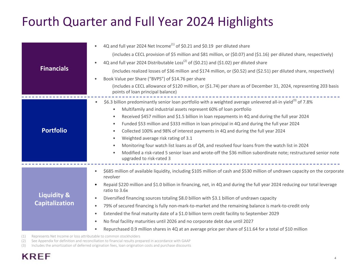 3 KKR Real Estate Finance Trust Inc. Overview Best In Class Portfolio Conservative Balance Sheet KREF’s Manager Fully Integrated with KKR $5.9 B Loan Portfolio 100% Senior Loans 60% Multifamily & Industrial $125 M Average Loan Size(1) 100% QTD Interest Collected Senior loans secured primarily by transitional, institutional multifamily and industrial properties owned by high quality sponsors $8.0 B Financing Capacity 79% Fully Non-Mark-to-Market(2) Conservative liability management focused on diversified non-mark-to-market financing 15% KKR Ownership in KREF $685 M Current Liquidity(3) $624 B Global AUM(4) $80 B Real Estate AUM(4)(5) ~140 Real Estate Professionals(4) One firm culture that rewards investment discipline, creativity and determination and emphasizes the sharing of information, resources, expertise and best practices (1) Average loan size is inclusive of the unfunded commitment (2) Based on outstanding principal amount of secured financing. The remaining is subject to credit marks only (3) Includes $105 million of cash, $530 million of undrawn corporate revolver capacity and $50 million of available borrowings based on existing collateral (4) As of September 30, 2024 (5) Figures represent AUM across all KKR real estate transactions