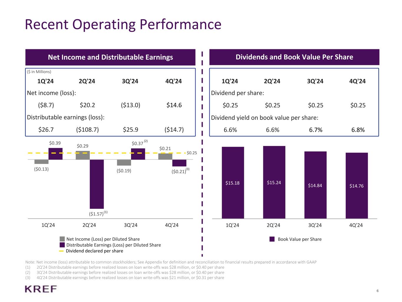 5 4Q'24 Financial Summary (1) See Appendix for definition and reconciliation to financial results prepared in accordance with GAAP (2) Includes real estate owned and an equity method investment (3) Book value per share includes CECL allowance of $120 million or ($1.74) per share and accumulated depreciation of $1 million or ($0.02) per share Income Statement ($ in Millions) 4Q'24 Net interest income $35.1 Other income 4.7 Provision for credit losses (4.6) Operating expenses (15.6) Preferred stock dividends (5.3) Other 0.3 Net Income Attributable to Common Stockholders $14.6 Net Income per Share, Diluted $0.21 Distributable Loss(1) ($14.7) Distributable Loss per Share, Diluted(1) ($0.21) Dividend per Share $0.25 Diluted Weighted Average Shares Outstanding 69,342,983 Balance Sheet ($ in Millions) 4Q'24 Commercial real estate loans, net $5,771.5 Real estate assets(2) 400.7 Cash 104.9 Other 73.2 Total Assets $6,350.4 Secured financing agreements, net $2,798.7 Collateralized loan obligations, net 1,766.1 Secured term loan, net 333.9 Other 52.9 Total Liabilities $4,951.5 Total Equity $1,398.9 Common Shareholders' Equity $1,017.3 Book Value per Share(3) $14.76 Common Shares Outstanding 68,713,596