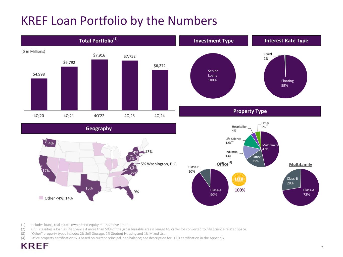 6 ($0.13) $0.29 ($0.19) $0.21 $0.39 ($1.57) $0.37 ($0.21) Net Income (Loss) per Diluted Share Distributable Earnings (Loss) per Diluted Share 1Q'24 2Q'24 3Q'24 4Q'24 Recent Operating Performance Note: Net income (loss) attributable to common stockholders; See Appendix for definition and reconciliation to financial results prepared in accordance with GAAP (1) 2Q'24 Distributable earnings before realized losses on loan write-offs was $28 million, or $0.40 per share (2) 3Q'24 Distributable earnings before realized losses on loan write-offs was $28 million, or $0.40 per share (3) 4Q'24 Distributable earnings before realized losses on loan write-offs was $21 million, or $0.31 per share Net Income and Distributable Earnings Dividends and Book Value Per Share ($ in Millions) 1Q'24 2Q'24 3Q'24 4Q'24 Net income (loss): ($8.7) $20.2 ($13.0) $14.6 Distributable earnings (loss): $26.7 ($108.7) $25.9 ($14.7) 1Q'24 2Q'24 3Q'24 4Q'24 Dividend per share: $0.25 $0.25 $0.25 $0.25 Dividend yield on book value per share: 6.6% 6.6% 6.7% 6.8% $15.18 $15.24 $14.84 $14.76 Book Value per Share 1Q'24 2Q'24 3Q'24 4Q'24 (2) Dividend declared per share (3) (1) $0.25