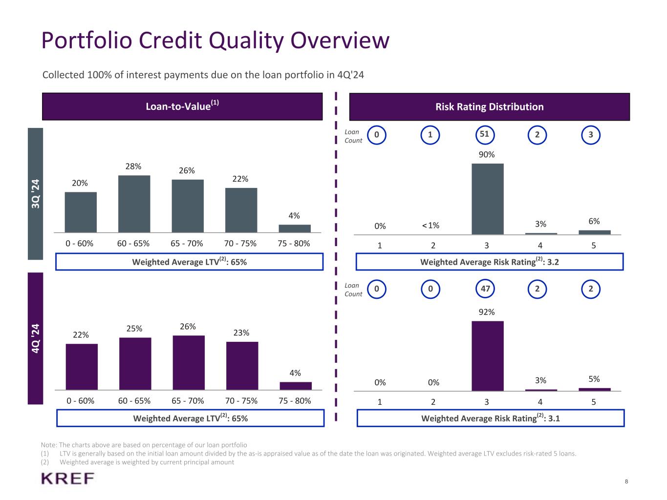 7 Class-A 72% Class-B 28% KREF Loan Portfolio by the Numbers (1) Includes loans, real estate owned and equity method investments (2) KREF classifies a loan as life science if more than 50% of the gross leasable area is leased to, or will be converted to, life science-related space (3) “Other” property types include: 2% Self-Storage, 2% Student Housing and 1% Mixed Use (4) Office property certification % is based on current principal loan balance; see description for LEED certification in the Appendix Geography Investment Type Property Type Interest Rate TypeTotal Portfolio(1) 4% 9% 9% 15% 17% 13% Other <4%: 14% ($ in Millions) 100% Office(4)5% Washington, D.C. $4,998 $6,792 $7,916 $7,752 $6,272 4Q'20 4Q'21 4Q'22 4Q'23 4Q'24 Senior Loans 100% Floating 99% Fixed 1% Multifamily Class-A 90% Class-B 10% Multifamily 47% Office 19% Industrial 13% Life Science 12% Hospitality 4% Other 5% (2) (3) 5% 4% 5%