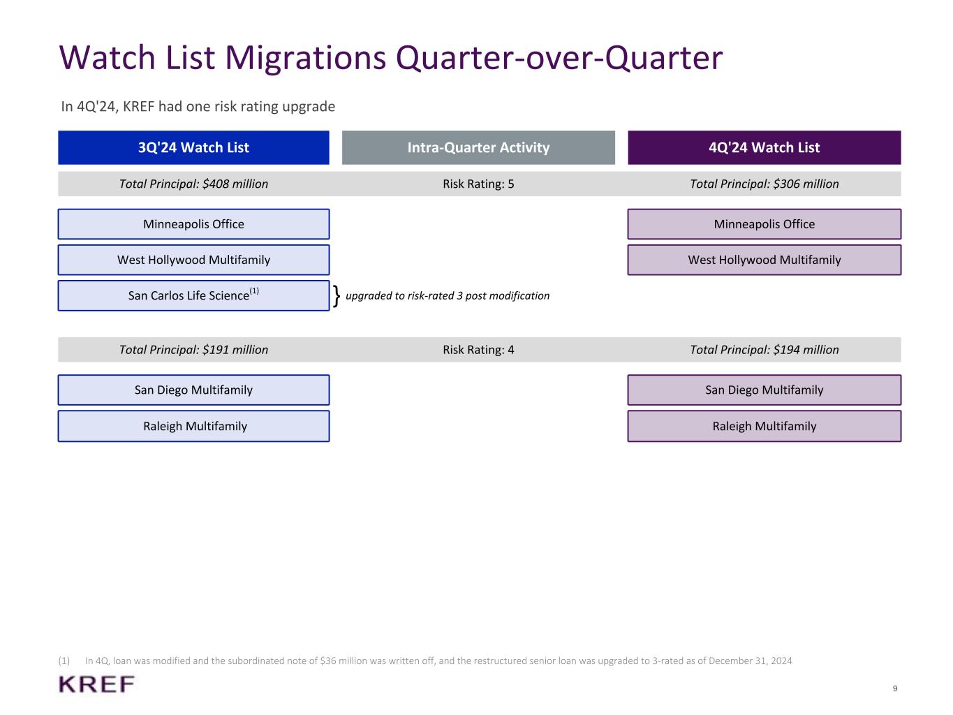 8 0% 1% 90% 3% 6% 1 2 3 4 5 Weighted Average Risk Rating(2): 3.1 Portfolio Credit Quality Overview Note: The charts above are based on percentage of our loan portfolio (1) LTV is generally based on the initial loan amount divided by the as-is appraised value as of the date the loan was originated. Weighted average LTV excludes risk-rated 5 loans. (2) Weighted average is weighted by current principal amount Collected 100% of interest payments due on the loan portfolio in 4Q'24 Loan-to-Value(1) Risk Rating Distribution Weighted Average LTV(2): 65% Loan Count 4Q '2 4 Weighted Average LTV(2): 65% Weighted Average Risk Rating(2): 3.2 3Q '2 4 20% 28% 26% 22% 4% 0 - 60% 60 - 65% 65 - 70% 70 - 75% 75 - 80% 22% 25% 26% 23% 4% 0 - 60% 60 - 65% 65 - 70% 70 - 75% 75 - 80% 0 1 2 351 0 0 2 247Loan Count 0% 0% 92% 3% 5% 1 2 3 4 5 <