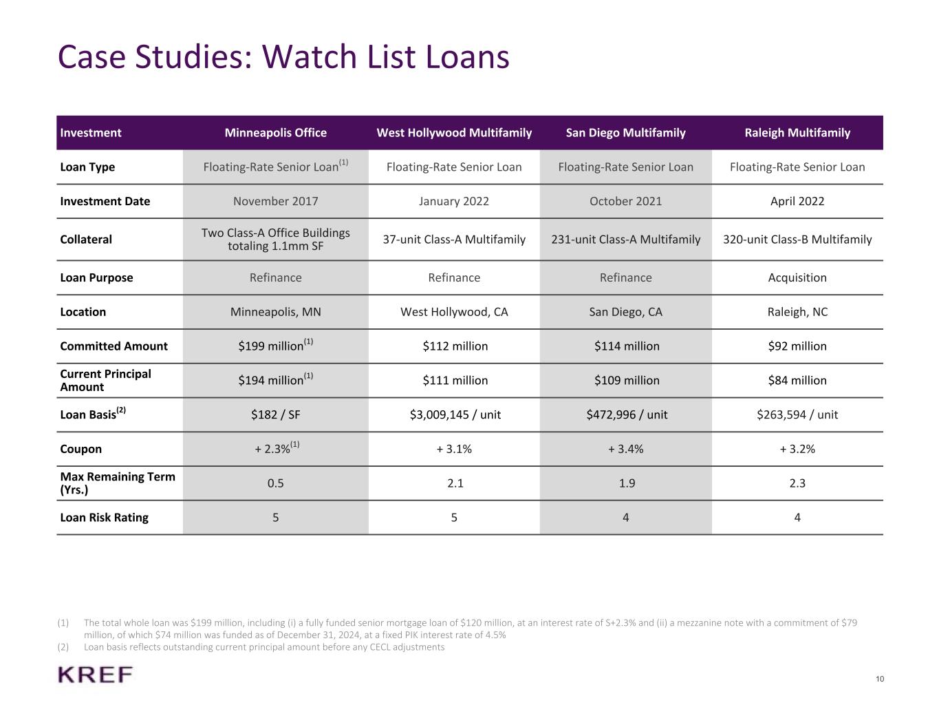 9 Watch List Migrations Quarter-over-Quarter In 4Q'24, KREF had one risk rating upgrade 3Q'24 Watch List Intra-Quarter Activity 4Q'24 Watch List Total Principal: $408 million Risk Rating: 5 Total Principal: $306 million Minneapolis Office Minneapolis Office West Hollywood Multifamily West Hollywood Multifamily San Carlos Life Science(1) } upgraded to risk-rated 3 post modification Total Principal: $191 million Risk Rating: 4 Total Principal: $194 million San Diego Multifamily San Diego Multifamily Raleigh Multifamily Raleigh Multifamily (1) In 4Q, loan was modified and the subordinated note of $36 million was written off, and the restructured senior loan was upgraded to 3-rated as of December 31, 2024