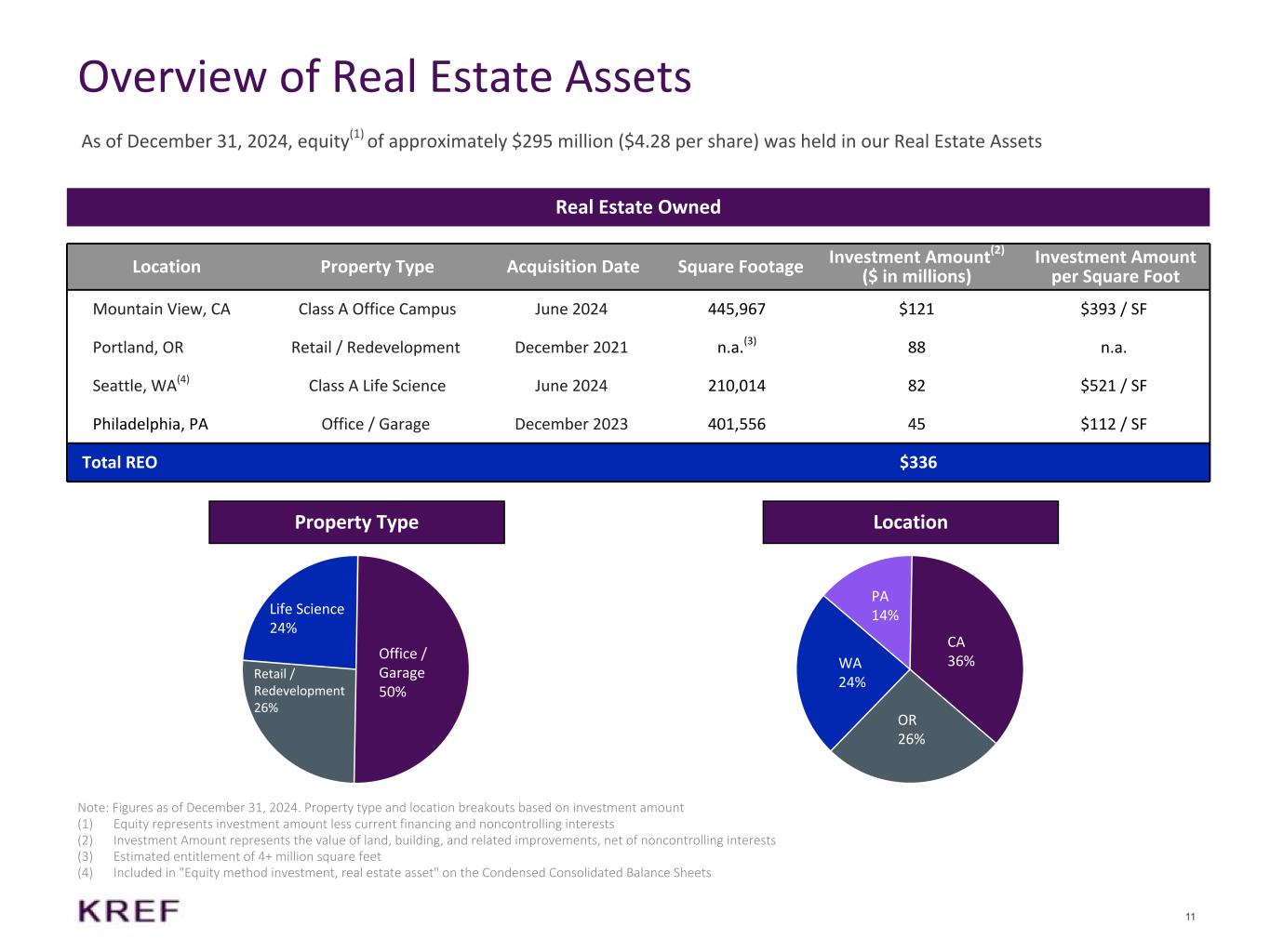10 Case Studies: Watch List Loans Investment Minneapolis Office West Hollywood Multifamily San Diego Multifamily Raleigh Multifamily Loan Type Floating-Rate Senior Loan(1) Floating-Rate Senior Loan Floating-Rate Senior Loan Floating-Rate Senior Loan Investment Date November 2017 January 2022 October 2021 April 2022 Collateral Two Class-A Office Buildings totaling 1.1mm SF 37-unit Class-A Multifamily 231-unit Class-A Multifamily 320-unit Class-B Multifamily Loan Purpose Refinance Refinance Refinance Acquisition Location Minneapolis, MN West Hollywood, CA San Diego, CA Raleigh, NC Committed Amount $199 million(1) $112 million $114 million $92 million Current Principal Amount $194 million(1) $111 million $109 million $84 million Loan Basis(2) $182 / SF $3,009,145 / unit $472,996 / unit $263,594 / unit Coupon + 2.3%(1) + 3.1% + 3.4% + 3.2% Max Remaining Term (Yrs.) 0.5 2.1 1.9 2.3 Loan Risk Rating 5 5 4 4 (1) The total whole loan was $199 million, including (i) a fully funded senior mortgage loan of $120 million, at an interest rate of S+2.3% and (ii) a mezzanine note with a commitment of $79 million, of which $74 million was funded as of December 31, 2024, at a fixed PIK interest rate of 4.5% (2) Loan basis reflects outstanding current principal amount before any CECL adjustments
