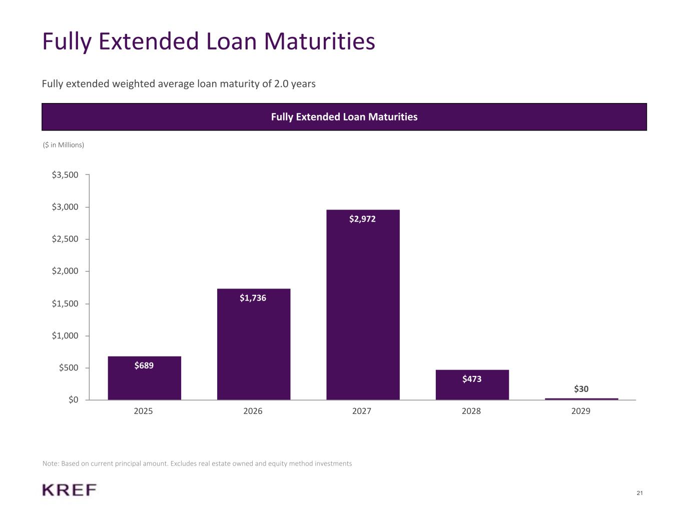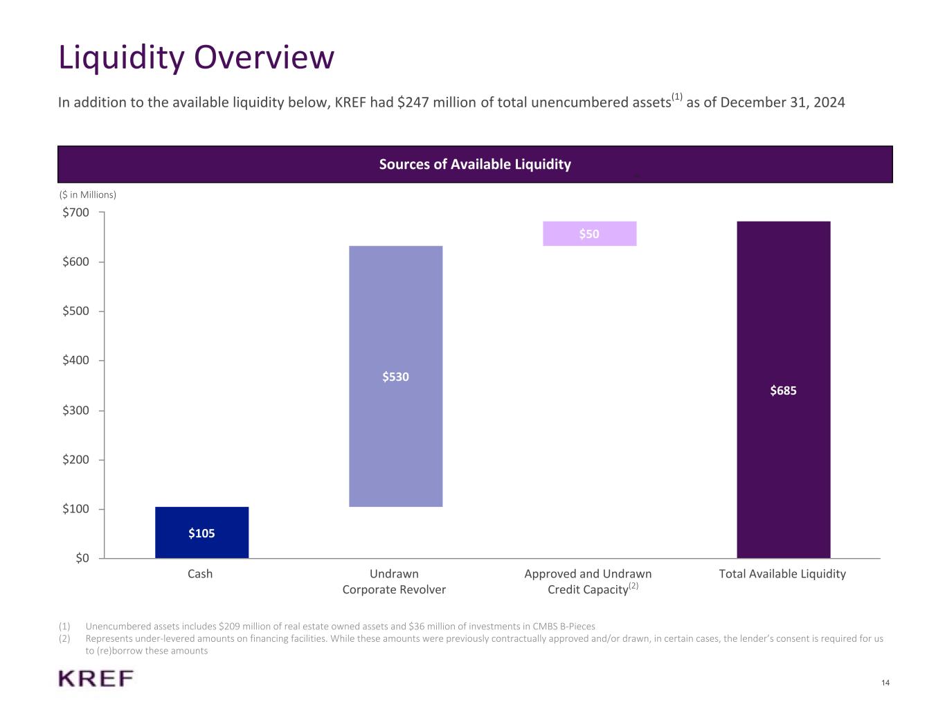 12 Collateralized Loan Obligations 36% Term Lending Agreements 16% Term Loan Facility 11% Secured Term Loan 7% Asset Specific 7% Revolver 2% Term Credit Facilities 21% Financing Overview: 79% Non-Mark-To-Market Diversified financing sources totaling $8.0 billion with $3.1 billion of undrawn capacity Summary of Outstanding Financing Leverage Ratios (3) Outstanding Financing(5) ($ in Millions) Maximum Capacity Outstanding Principal Amount Weighted Avg. Coupon(1) Advance Rate Non- MTM Term Credit Facilities $2,000 $1,038 +1.8% 66.6% (2) Term Lending Agreements $1,288 $790 +1.8% 68.4% ü Warehouse Facility $500 $0 n/a n/a ü Secured Term Loan $340 $340 +3.8% — ü Corporate Revolving Credit Facility $610 $80 +2.0% — ü Total Debt $4,738 $2,248 Collateralized Loan Obligations $1,766 $1,766 +1.6% 83.2% ü Term Loan Facility $1,000 $554 +2.0% 77.6% ü Asset Specific Financing $491 $343 +2.9% 82.8% ü Total Leverage $7,995 $4,911 1.6 3.6 Debt-To-Equity Ratio Total Leverage Ratio(4) x (1) Weighted average coupon expressed as spread over Term SOFR (2) Term credit facilities are marked to credit only and not subject to capital markets mark-to-market provisions (3) Represents (i) total outstanding debt agreements (excluding non-recourse facilities), and secured term loan, less cash to (ii) KREF stockholders' equity, in each case, at period end (4) Represents (i) total outstanding debt agreements, secured term loan, and collateralized loan obligations, less cash to (ii) KREF stockholder's equity, in each case, at period end (5) Based on outstanding principal amount of secured financing Non-Mark- to-Market 79% x