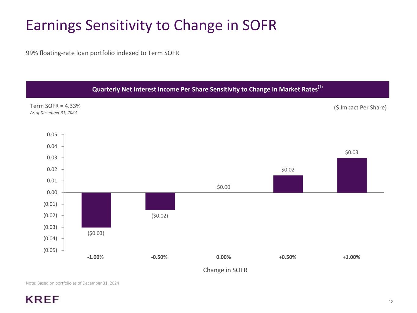 14 $105 $635 $105 $530 $50 $685 Cash Undrawn Corporate Revolver Approved and Undrawn Credit Capacity Total Available Liquidity $0 $100 $200 $300 $400 $500 $600 $700 Liquidity Overview (1) Unencumbered assets includes $209 million of real estate owned assets and $36 million of investments in CMBS B-Pieces (2) Represents under-levered amounts on financing facilities. While these amounts were previously contractually approved and/or drawn, in certain cases, the lender’s consent is required for us to (re)borrow these amounts ($ in Millions) Sources of Available Liquidity In addition to the available liquidity below, KREF had $247 million of total unencumbered assets(1) as of December 31, 2024 (4) (2)