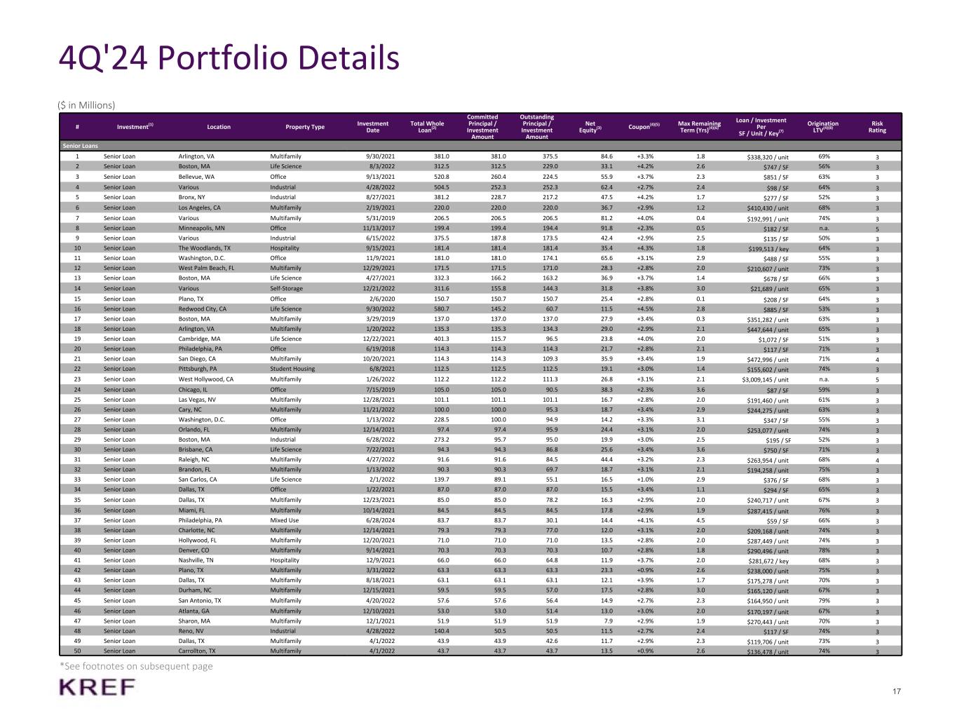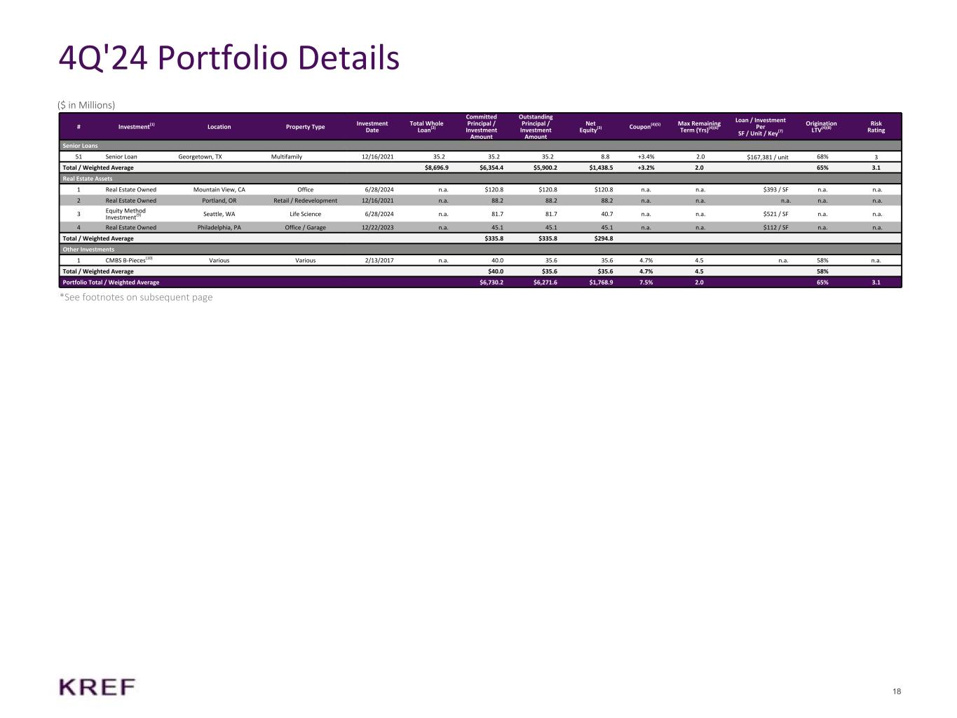 17 4Q'24 Portfolio Details ($ in Millions) # Investment(1) Location Property Type Investment Date Total Whole Loan(2) Committed Principal / Investment Amount Outstanding Principal / Investment Amount Net Equity(3) Coupon(4)(5) Max Remaining Term (Yrs)(4)(6) Loan / Investment Per SF / Unit / Key(7) Origination LTV(4)(8) Risk Rating Senior Loans 1 Senior Loan Arlington, VA Multifamily 9/30/2021 381.0 381.0 375.5 84.6 +3.3% 1.8 $338,320 / unit 69% 3 2 Senior Loan Boston, MA Life Science 8/3/2022 312.5 312.5 229.0 33.1 +4.2% 2.6 $747 / SF 56% 3 3 Senior Loan Bellevue, WA Office 9/13/2021 520.8 260.4 224.5 55.9 +3.7% 2.3 $851 / SF 63% 3 4 Senior Loan Various Industrial 4/28/2022 504.5 252.3 252.3 62.4 +2.7% 2.4 $98 / SF 64% 3 5 Senior Loan Bronx, NY Industrial 8/27/2021 381.2 228.7 217.2 47.5 +4.2% 1.7 $277 / SF 52% 3 6 Senior Loan Los Angeles, CA Multifamily 2/19/2021 220.0 220.0 220.0 36.7 +2.9% 1.2 $410,430 / unit 68% 3 7 Senior Loan Various Multifamily 5/31/2019 206.5 206.5 206.5 81.2 +4.0% 0.4 $192,991 / unit 74% 3 8 Senior Loan Minneapolis, MN Office 11/13/2017 199.4 199.4 194.4 91.8 +2.3% 0.5 $182 / SF n.a. 5 9 Senior Loan Various Industrial 6/15/2022 375.5 187.8 173.5 42.4 +2.9% 2.5 $135 / SF 50% 3 10 Senior Loan The Woodlands, TX Hospitality 9/15/2021 181.4 181.4 181.4 35.4 +4.3% 1.8 $199,513 / key 64% 3 11 Senior Loan Washington, D.C. Office 11/9/2021 181.0 181.0 174.1 65.6 +3.1% 2.9 $488 / SF 55% 3 12 Senior Loan West Palm Beach, FL Multifamily 12/29/2021 171.5 171.5 171.0 28.3 +2.8% 2.0 $210,607 / unit 73% 3 13 Senior Loan Boston, MA Life Science 4/27/2021 332.3 166.2 163.2 36.9 +3.7% 1.4 $678 / SF 66% 3 14 Senior Loan Various Self-Storage 12/21/2022 311.6 155.8 144.3 31.8 +3.8% 3.0 $21,689 / unit 65% 3 15 Senior Loan Plano, TX Office 2/6/2020 150.7 150.7 150.7 25.4 +2.8% 0.1 $208 / SF 64% 3 16 Senior Loan Redwood City, CA Life Science 9/30/2022 580.7 145.2 60.7 11.5 +4.5% 2.8 $885 / SF 53% 3 17 Senior Loan Boston, MA Multifamily 3/29/2019 137.0 137.0 137.0 27.9 +3.4% 0.3 $351,282 / unit 63% 3 18 Senior Loan Arlington, VA Multifamily 1/20/2022 135.3 135.3 134.3 29.0 +2.9% 2.1 $447,644 / unit 65% 3 19 Senior Loan Cambridge, MA Life Science 12/22/2021 401.3 115.7 96.5 23.8 +4.0% 2.0 $1,072 / SF 51% 3 20 Senior Loan Philadelphia, PA Office 6/19/2018 114.3 114.3 114.3 21.7 +2.8% 2.1 $117 / SF 71% 3 21 Senior Loan San Diego, CA Multifamily 10/20/2021 114.3 114.3 109.3 35.9 +3.4% 1.9 $472,996 / unit 71% 4 22 Senior Loan Pittsburgh, PA Student Housing 6/8/2021 112.5 112.5 112.5 19.1 +3.0% 1.4 $155,602 / unit 74% 3 23 Senior Loan West Hollywood, CA Multifamily 1/26/2022 112.2 112.2 111.3 26.8 +3.1% 2.1 $3,009,145 / unit n.a. 5 24 Senior Loan Chicago, IL Office 7/15/2019 105.0 105.0 90.5 38.3 +2.3% 3.6 $87 / SF 59% 3 25 Senior Loan Las Vegas, NV Multifamily 12/28/2021 101.1 101.1 101.1 16.7 +2.8% 2.0 $191,460 / unit 61% 3 26 Senior Loan Cary, NC Multifamily 11/21/2022 100.0 100.0 95.3 18.7 +3.4% 2.9 $244,275 / unit 63% 3 27 Senior Loan Washington, D.C. Office 1/13/2022 228.5 100.0 94.9 14.2 +3.3% 3.1 $347 / SF 55% 3 28 Senior Loan Orlando, FL Multifamily 12/14/2021 97.4 97.4 95.9 24.4 +3.1% 2.0 $253,077 / unit 74% 3 29 Senior Loan Boston, MA Industrial 6/28/2022 273.2 95.7 95.0 19.9 +3.0% 2.5 $195 / SF 52% 3 30 Senior Loan Brisbane, CA Life Science 7/22/2021 94.3 94.3 86.8 25.6 +3.4% 3.6 $750 / SF 71% 3 31 Senior Loan Raleigh, NC Multifamily 4/27/2022 91.6 91.6 84.5 44.4 +3.2% 2.3 $263,954 / unit 68% 4 32 Senior Loan Brandon, FL Multifamily 1/13/2022 90.3 90.3 69.7 18.7 +3.1% 2.1 $194,258 / unit 75% 3 33 Senior Loan San Carlos, CA Life Science 2/1/2022 139.7 89.1 55.1 16.5 +1.0% 2.9 $376 / SF 68% 3 34 Senior Loan Dallas, TX Office 1/22/2021 87.0 87.0 87.0 15.5 +3.4% 1.1 $294 / SF 65% 3 35 Senior Loan Dallas, TX Multifamily 12/23/2021 85.0 85.0 78.2 16.3 +2.9% 2.0 $240,717 / unit 67% 3 36 Senior Loan Miami, FL Multifamily 10/14/2021 84.5 84.5 84.5 17.8 +2.9% 1.9 $287,415 / unit 76% 3 37 Senior Loan Philadelphia, PA Mixed Use 6/28/2024 83.7 83.7 30.1 14.4 +4.1% 4.5 $59 / SF 66% 3 38 Senior Loan Charlotte, NC Multifamily 12/14/2021 79.3 79.3 77.0 12.0 +3.1% 2.0 $209,168 / unit 74% 3 39 Senior Loan Hollywood, FL Multifamily 12/20/2021 71.0 71.0 71.0 13.5 +2.8% 2.0 $287,449 / unit 74% 3 40 Senior Loan Denver, CO Multifamily 9/14/2021 70.3 70.3 70.3 10.7 +2.8% 1.8 $290,496 / unit 78% 3 41 Senior Loan Nashville, TN Hospitality 12/9/2021 66.0 66.0 64.8 11.9 +3.7% 2.0 $281,672 / key 68% 3 42 Senior Loan Plano, TX Multifamily 3/31/2022 63.3 63.3 63.3 23.3 +0.9% 2.6 $238,000 / unit 75% 3 43 Senior Loan Dallas, TX Multifamily 8/18/2021 63.1 63.1 63.1 12.1 +3.9% 1.7 $175,278 / unit 70% 3 44 Senior Loan Durham, NC Multifamily 12/15/2021 59.5 59.5 57.0 17.5 +2.8% 3.0 $165,120 / unit 67% 3 45 Senior Loan San Antonio, TX Multifamily 4/20/2022 57.6 57.6 56.4 14.9 +2.7% 2.3 $164,950 / unit 79% 3 46 Senior Loan Atlanta, GA Multifamily 12/10/2021 53.0 53.0 51.4 13.0 +3.0% 2.0 $170,197 / unit 67% 3 47 Senior Loan Sharon, MA Multifamily 12/1/2021 51.9 51.9 51.9 7.9 +2.9% 1.9 $270,443 / unit 70% 3 48 Senior Loan Reno, NV Industrial 4/28/2022 140.4 50.5 50.5 11.5 +2.7% 2.4 $117 / SF 74% 3 49 Senior Loan Dallas, TX Multifamily 4/1/2022 43.9 43.9 42.6 11.7 +2.9% 2.3 $119,706 / unit 73% 3 50 Senior Loan Carrollton, TX Multifamily 4/1/2022 43.7 43.7 43.7 13.5 +0.9% 2.6 $136,478 / unit 74% 3 *See footnotes on subsequent page