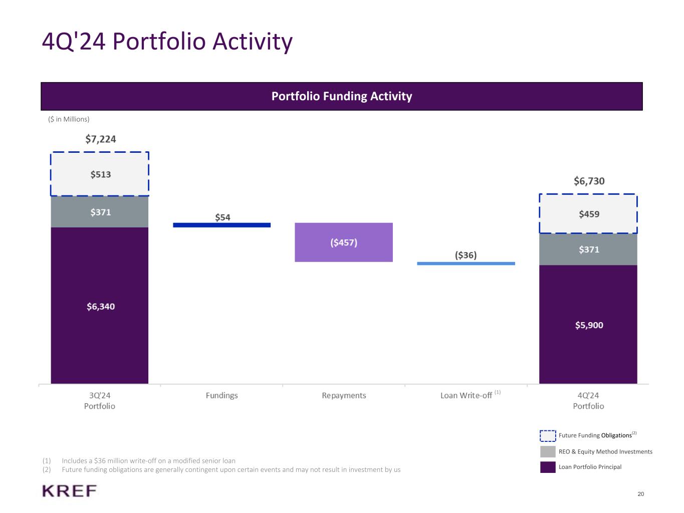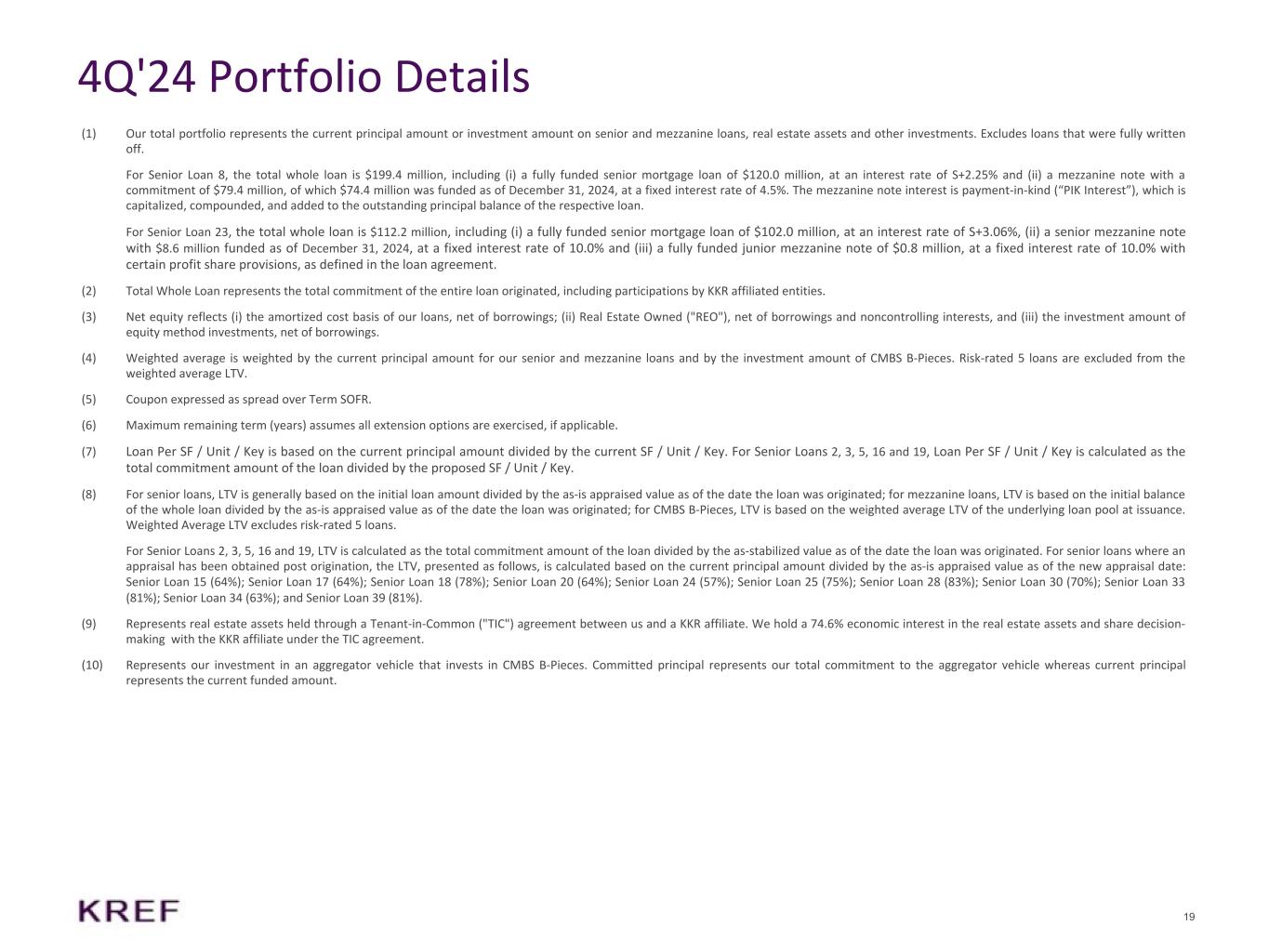 19 4Q'24 Portfolio Details (1) Our total portfolio represents the current principal amount or investment amount on senior and mezzanine loans, real estate assets and other investments. Excludes loans that were fully written off. For Senior Loan 8, the total whole loan is $199.4 million, including (i) a fully funded senior mortgage loan of $120.0 million, at an interest rate of S+2.25% and (ii) a mezzanine note with a commitment of $79.4 million, of which $74.4 million was funded as of December 31, 2024, at a fixed interest rate of 4.5%. The mezzanine note interest is payment-in-kind (“PIK Interest”), which is capitalized, compounded, and added to the outstanding principal balance of the respective loan. For Senior Loan 23, the total whole loan is $112.2 million, including (i) a fully funded senior mortgage loan of $102.0 million, at an interest rate of S+3.06%, (ii) a senior mezzanine note with $8.6 million funded as of December 31, 2024, at a fixed interest rate of 10.0% and (iii) a fully funded junior mezzanine note of $0.8 million, at a fixed interest rate of 10.0% with certain profit share provisions, as defined in the loan agreement. (2) Total Whole Loan represents the total commitment of the entire loan originated, including participations by KKR affiliated entities. (3) Net equity reflects (i) the amortized cost basis of our loans, net of borrowings; (ii) Real Estate Owned ("REO"), net of borrowings and noncontrolling interests, and (iii) the investment amount of equity method investments, net of borrowings. (4) Weighted average is weighted by the current principal amount for our senior and mezzanine loans and by the investment amount of CMBS B-Pieces. Risk-rated 5 loans are excluded from the weighted average LTV. (5) Coupon expressed as spread over Term SOFR. (6) Maximum remaining term (years) assumes all extension options are exercised, if applicable. (7) Loan Per SF / Unit / Key is based on the current principal amount divided by the current SF / Unit / Key. For Senior Loans 2, 3, 5, 16 and 19, Loan Per SF / Unit / Key is calculated as the total commitment amount of the loan divided by the proposed SF / Unit / Key. (8) For senior loans, LTV is generally based on the initial loan amount divided by the as-is appraised value as of the date the loan was originated; for mezzanine loans, LTV is based on the initial balance of the whole loan divided by the as-is appraised value as of the date the loan was originated; for CMBS B-Pieces, LTV is based on the weighted average LTV of the underlying loan pool at issuance. Weighted Average LTV excludes risk-rated 5 loans. For Senior Loans 2, 3, 5, 16 and 19, LTV is calculated as the total commitment amount of the loan divided by the as-stabilized value as of the date the loan was originated. For senior loans where an appraisal has been obtained post origination, the LTV, presented as follows, is calculated based on the current principal amount divided by the as-is appraised value as of the new appraisal date: Senior Loan 15 (64%); Senior Loan 17 (64%); Senior Loan 18 (78%); Senior Loan 20 (64%); Senior Loan 24 (57%); Senior Loan 25 (75%); Senior Loan 28 (83%); Senior Loan 30 (70%); Senior Loan 33 (81%); Senior Loan 34 (63%); and Senior Loan 39 (81%). (9) Represents real estate assets held through a Tenant-in-Common ("TIC") agreement between us and a KKR affiliate. We hold a 74.6% economic interest in the real estate assets and share decision- making with the KKR affiliate under the TIC agreement. (10) Represents our investment in an aggregator vehicle that invests in CMBS B-Pieces. Committed principal represents our total commitment to the aggregator vehicle whereas current principal represents the current funded amount.