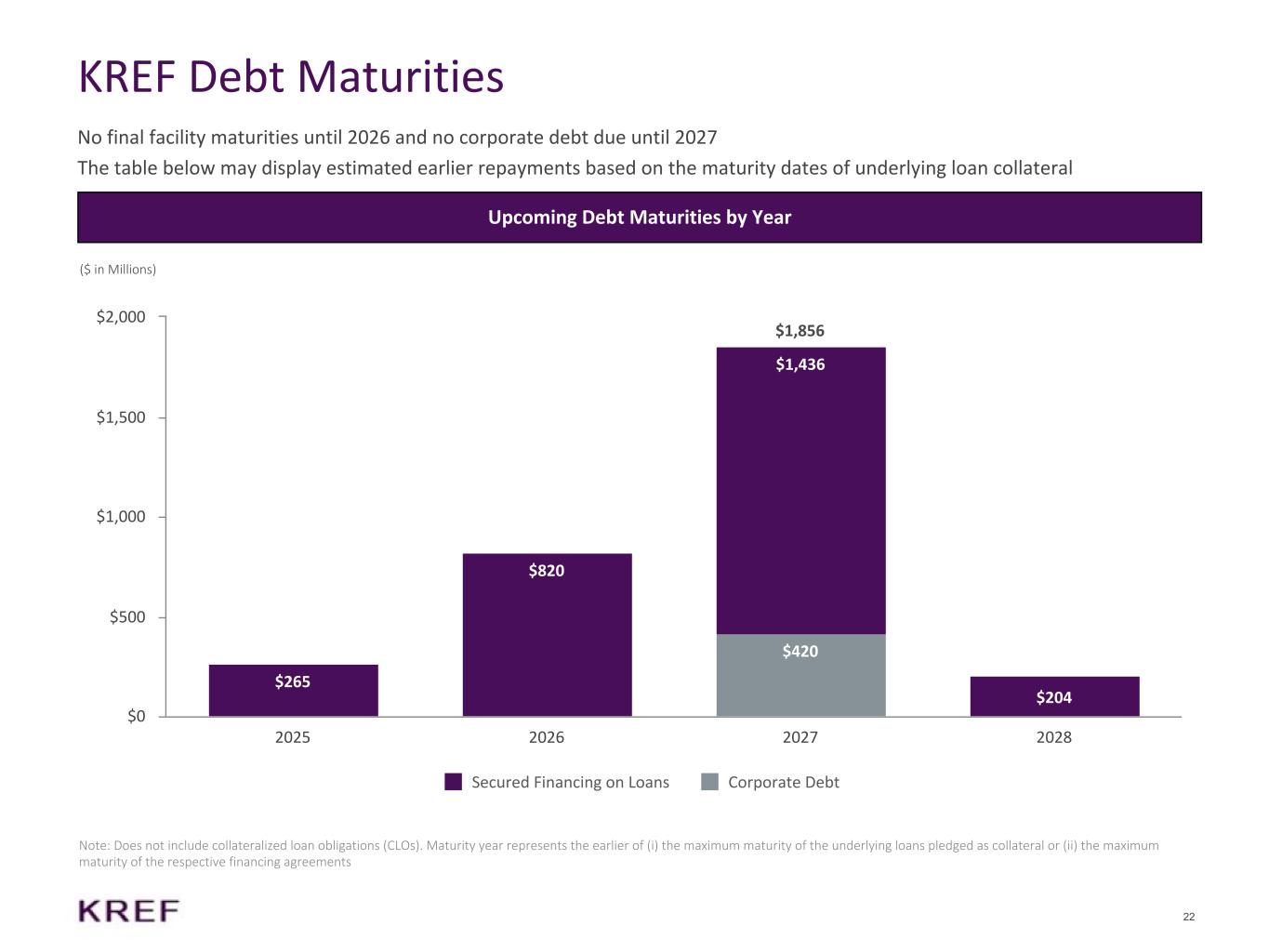 22 KREF Debt Maturities Note: Does not include collateralized loan obligations (CLOs). Maturity year represents the earlier of (i) the maximum maturity of the underlying loans pledged as collateral or (ii) the maximum maturity of the respective financing agreements Upcoming Debt Maturities by Year ($ in Millions) $420 $0 $265 $820 $1,436 $204 Secured Financing on Loans Corporate Debt 2025 2026 2027 2028 $0 $500 $1,000 $1,500 $2,000 No final facility maturities until 2026 and no corporate debt due until 2027 The table below may display estimated earlier repayments based on the maturity dates of underlying loan collateral $1,856