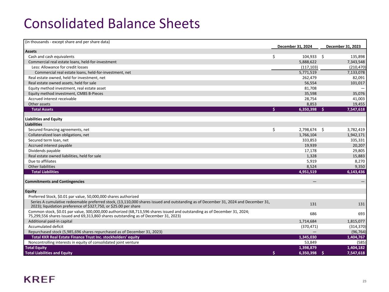 23 Consolidated Balance Sheets (in thousands - except share and per share data) December 31, 2024 December 31, 2023 Assets Cash and cash equivalents $ 104,933 $ 135,898 Commercial real estate loans, held-for-investment 5,888,622 7,343,548 Less: Allowance for credit losses (117,103) (210,470) Commercial real estate loans, held-for-investment, net 5,771,519 7,133,078 Real estate owned, held for investment, net 262,479 82,091 Real estate owned assets, held for sale 56,554 101,017 Equity method investment, real estate asset 81,708 — Equity method investment, CMBS B-Pieces 35,598 35,076 Accrued interest receivable 28,754 41,003 Other assets 8,853 19,455 Total Assets $ 6,350,398 $ 7,547,618 Liabilities and Equity Liabilities Secured financing agreements, net $ 2,798,674 $ 3,782,419 Collateralized loan obligations, net 1,766,104 1,942,171 Secured term loan, net 333,853 335,331 Accrued interest payable 19,939 20,207 Dividends payable 17,178 29,805 Real estate owned liabilities, held for sale 1,328 15,883 Due to affiliates 5,919 8,270 Other liabilities 8,524 9,350 Total Liabilities 4,951,519 6,143,436 Commitments and Contingencies — — Equity Preferred Stock, $0.01 par value, 50,000,000 shares authorized Series A cumulative redeemable preferred stock, (13,110,000 shares issued and outstanding as of December 31, 2024 and December 31, 2023); liquidation preference of $327,750, or $25.00 per share 131 131 Common stock, $0.01 par value, 300,000,000 authorized (68,713,596 shares issued and outstanding as of December 31, 2024; 75,299,556 shares issued and 69,313,860 shares outstanding as of December 31, 2023) 686 693 Additional paid-in capital 1,714,684 1,815,077 Accumulated deficit (370,471) (314,370) Repurchased stock (5,985,696 shares repurchased as of December 31, 2023) — (96,764) Total KKR Real Estate Finance Trust Inc. stockholders' equity 1,345,030 1,404,767 Noncontrolling interests in equity of consolidated joint venture 53,849 (585) Total Equity 1,398,879 1,404,182 Total Liabilities and Equity $ 6,350,398 $ 7,547,618