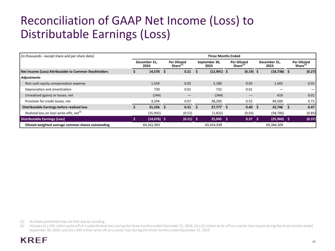 24 Consolidated Statements of Income (in thousands - except share and per share data) Three Months Ended Year Ended December 31, 2024 September 30, 2024 December 31, 2023 December 31, 2024 December 31, 2023 Net Interest Income Interest income $ 123,610 $ 140,150 $ 165,024 $ 564,629 $ 640,412 Interest expense 88,476 103,145 118,532 412,913 458,802 Total net interest income 35,134 37,005 46,492 151,716 181,610 Other income Income (loss) from equity method investments (101) 156 374 1,518 1,417 Other miscellanous income 1,194 1,320 1,280 5,738 11,237 Revenue from real estate owned operations 3,564 8,539 2,520 22,866 8,545 Gain (loss) on sale of investments — — — (615) — Total other income 4,657 10,015 4,174 29,507 21,199 Operating Expenses Provision for (reversal of) credit losses, net 4,594 38,200 49,500 80,605 175,116 Management fees to affiliate 5,919 5,901 6,523 24,533 26,171 Incentive compensation to affiliate — — — — 2,491 General and administrative 3,955 4,668 4,600 18,410 18,788 Expenses from real estate owned operations 5,722 5,488 2,957 23,100 11,190 Total operating expenses 20,190 54,257 63,580 146,648 233,756 Income (Loss) Before Income Taxes 19,601 (7,237) (12,914) 34,575 (30,947) Income tax expense 45 91 199 248 710 Net Income (Loss) 19,556 (7,328) (13,113) 34,327 (31,657) Net income (loss) attributable to noncontrolling interests (699) 60 (226) (1,264) (806) Net Income (Loss) Attributable to KREF Trust Inc. and Subsidiaries 20,255 (7,388) (12,887) 35,591 (30,851) Preferred stock dividends 5,326 5,326 5,326 21,304 21,304 Participating securities' shares in earnings 351 277 525 1,216 1,764 Net Income (Loss) Attributable to Common Stockholders $ 14,578 $ (12,991) $ (18,738) $ 13,071 $ (53,919) Net Income (Loss) Per Share of Common Stock, Basic and Diluted $ 0.21 $ (0.19) $ (0.27) $ 0.19 $ (0.78) Weighted Average Number of Shares of Common Stock Outstanding, Basic and Diluted 69,342,983 69,434,938 69,384,309 69,396,890 69,180,039 Dividends Declared per Share of Common Stock $ 0.25 $ 0.25 $ 0.43 $ 1.00 $ 1.72