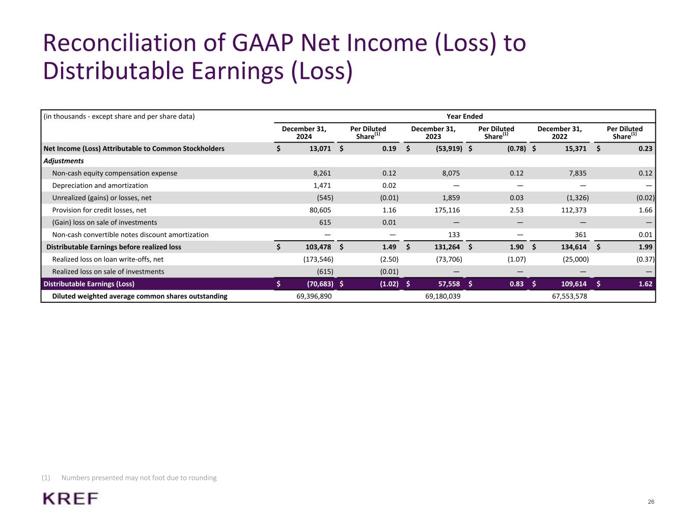 25 Reconciliation of GAAP Net Income (Loss) to Distributable Earnings (Loss) (1) Numbers presented may not foot due to rounding (2) Includes (i) a $36 million write-off of a subordinated loan during the three months ended December 31, 2024; (ii) a $2 million write-off on a senior loan repaid during the three months ended September 30, 2024; and (iii) a $59 million write-off on a senior loan during the three months ended December 31, 2023 (in thousands - except share and per share data) Three Months Ended December 31, 2024 Per Diluted Share(1) September 30, 2024 Per Diluted Share(1) December 31, 2023 Per Diluted Share(1) Net Income (Loss) Attributable to Common Stockholders $ 14,578 $ 0.21 $ (12,991) $ (0.19) $ (18,738) $ (0.27) Adjustments Non-cash equity compensation expense 1,559 0.02 2,180 0.03 1,565 0.02 Depreciation and amortization 739 0.01 732 0.01 — — Unrealized (gains) or losses, net (244) — (344) — 419 0.01 Provision for credit losses, net 4,594 0.07 38,200 0.55 49,500 0.71 Distributable Earnings before realized loss $ 21,226 $ 0.31 $ 27,777 $ 0.40 $ 32,746 $ 0.47 Realized loss on loan write-offs, net(2) (35,902) (0.52) (1,832) (0.03) (58,706) (0.85) Distributable Earnings (Loss) $ (14,676) $ (0.21) $ 25,945 $ 0.37 $ (25,960) $ (0.37) Diluted weighted average common shares outstanding 69,342,983 69,434,938 69,384,309