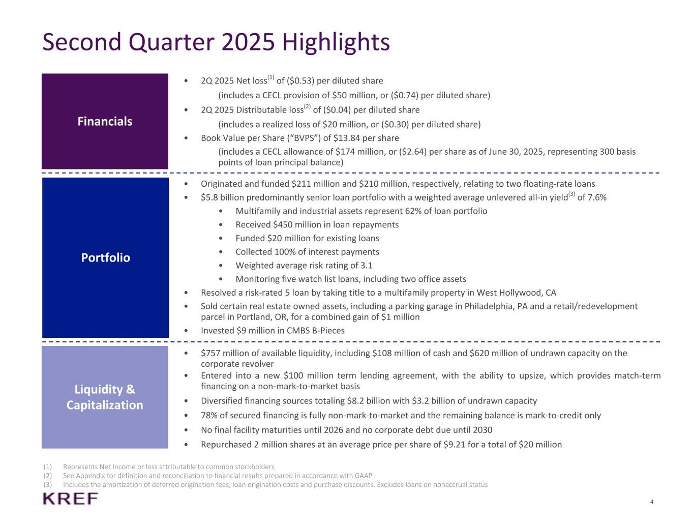 3 KKR Real Estate Finance Trust Inc. Overview Best In Class Portfolio Conservative Balance Sheet KREF’s Manager Fully Integrated with KKR $5.8 B Loan Portfolio 100% Senior Loans 62% Multifamily & Industrial $117 M Average Loan Size(1) 100% QTD Interest Collected Senior loans secured primarily by transitional, institutional multifamily and industrial properties owned by high quality sponsors $8.2 B Financing Capacity 78% Fully Non-Mark-to-Market(2) Conservative liability management focused on diversified non-mark-to-market financing 15% KKR Ownership in KREF $757 M Current Liquidity(3) $664 B Global AUM(4) $81 B Real Estate AUM(4)(5) 145 Real Estate Professionals(4) One firm culture that rewards investment discipline, creativity and determination and emphasizes the sharing of information, resources, expertise and best practices (1) Average loan size is inclusive of the unfunded commitment (2) Based on outstanding principal amount of secured financing. The remaining is subject to credit marks only (3) Includes $108 million of cash, $620 million of undrawn corporate revolver capacity and $29 million of available borrowings based on existing collateral (4) As of March 31, 2025 (5) Figures represent AUM across all KKR real estate transactions