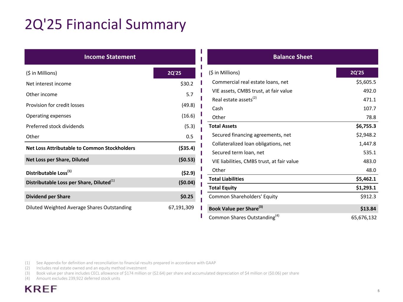 4 • 2Q 2025 Net loss(1) of ($0.53) per diluted share (includes a CECL provision of $50 million, or ($0.74) per diluted share) • 2Q 2025 Distributable loss(2) of ($0.04) per diluted share (includes a realized loss of $20 million, or ($0.30) per diluted share) • Book Value per Share (“BVPS”) of $13.84 per share (includes a CECL allowance of $174 million, or ($2.64) per share as of June 30, 2025, representing 300 basis points of loan principal balance) Second Quarter 2025 Highlights (1) Represents Net Income or loss attributable to common stockholders (2) See Appendix for definition and reconciliation to financial results prepared in accordance with GAAP (3) Includes the amortization of deferred origination fees, loan origination costs and purchase discounts. Excludes loans on nonaccrual status • Originated and funded $211 million and $210 million, respectively, relating to two floating-rate loans • $5.8 billion predominantly senior loan portfolio with a weighted average unlevered all-in yield(3) of 7.6% • Multifamily and industrial assets represent 62% of loan portfolio • Received $450 million in loan repayments • Funded $20 million for existing loans • Collected 100% of interest payments • Weighted average risk rating of 3.1 • Monitoring five watch list loans, including two office assets • Resolved a risk-rated 5 loan by taking title to a multifamily property in West Hollywood, CA • Sold certain real estate owned assets, including a parking garage in Philadelphia, PA and a retail/redevelopment parcel in Portland, OR, for a combined gain of $1 million • Invested $9 million in CMBS B-Pieces Financials Portfolio Liquidity & Capitalization • $757 million of available liquidity, including $108 million of cash and $620 million of undrawn capacity on the corporate revolver • Entered into a new $100 million term lending agreement, with the ability to upsize, which provides match-term financing on a non-mark-to-market basis • Diversified financing sources totaling $8.2 billion with $3.2 billion of undrawn capacity • 78% of secured financing is fully non-mark-to-market and the remaining balance is mark-to-credit only • No final facility maturities until 2026 and no corporate debt due until 2030 • Repurchased 2 million shares at an average price per share of $9.21 for a total of $20 million