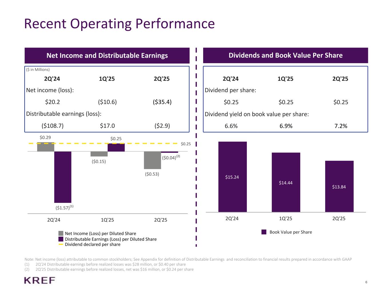 5 2Q'25 Financial Summary (1) See Appendix for definition and reconciliation to financial results prepared in accordance with GAAP (2) Includes real estate owned and an equity method investment (3) Book value per share includes CECL allowance of $174 million or ($2.64) per share and accumulated depreciation of $4 million or ($0.06) per share (4) Amount excludes 239,922 deferred stock units Income Statement ($ in Millions) 2Q'25 Net interest income $30.2 Other income 5.7 Provision for credit losses (49.8) Operating expenses (16.6) Preferred stock dividends (5.3) Other 0.5 Net Loss Attributable to Common Stockholders ($35.4) Net Loss per Share, Diluted ($0.53) Distributable Loss(1) ($2.9) Distributable Loss per Share, Diluted(1) ($0.04) Dividend per Share $0.25 Diluted Weighted Average Shares Outstanding 67,191,309 Balance Sheet ($ in Millions) 2Q'25 Commercial real estate loans, net $5,605.5 VIE assets, CMBS trust, at fair value 492.0 Real estate assets(2) 471.1 Cash 107.7 Other 78.8 Total Assets $6,755.3 Secured financing agreements, net $2,948.2 Collateralized loan obligations, net 1,447.8 Secured term loan, net 535.1 VIE liabilities, CMBS trust, at fair value 483.0 Other 48.0 Total Liabilities $5,462.1 Total Equity $1,293.1 Common Shareholders' Equity $912.3 Book Value per Share(3) $13.84 Common Shares Outstanding(4) 65,676,132