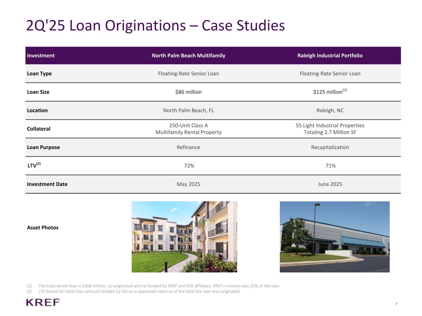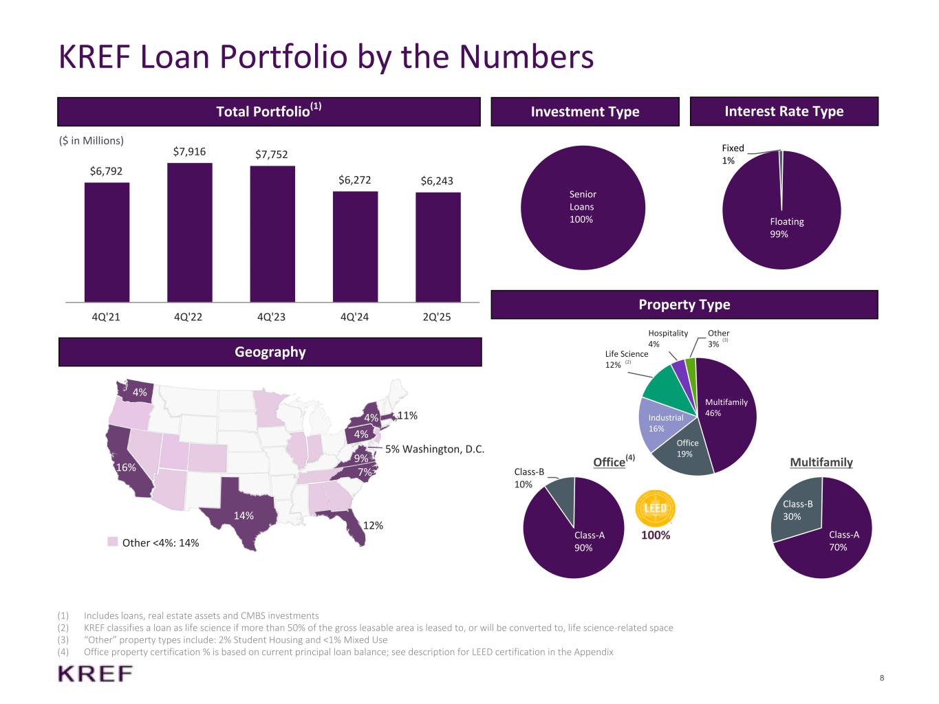 7 2Q'25 Loan Originations – Case Studies Investment North Palm Beach Multifamily Raleigh Industrial Portfolio Loan Type Floating-Rate Senior Loan Floating-Rate Senior Loan Loan Size $86 million $125 million(1) Location North Palm Beach, FL Raleigh, NC Collateral 250-Unit Class A Multifamily Rental Property 55 Light Industrial Properties Totaling 2.7 Million SF Loan Purpose Refinance Recapitalization LTV(2) 72% 71% Investment Date May 2025 June 2025 Asset Photos (1) The total whole loan is $408 million, co-originated and co-funded by KREF and KKR affiliates. KREF’s interest was 31% of the loan (2) LTV based on initial loan amount divided by the as-is appraised value as of the date the loan was originated