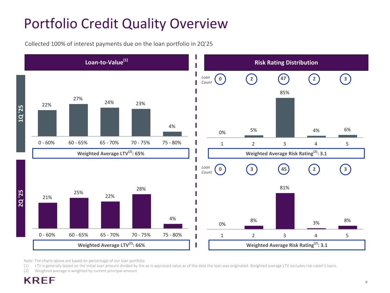 8 Multifamily 46% Office 19% Industrial 16% Life Science 12% Hospitality 4% Other 3% Class-A 70% Class-B 30% KREF Loan Portfolio by the Numbers (1) Includes loans, real estate assets and CMBS investments (2) KREF classifies a loan as life science if more than 50% of the gross leasable area is leased to, or will be converted to, life science-related space (3) “Other” property types include: 2% Student Housing and <1% Mixed Use (4) Office property certification % is based on current principal loan balance; see description for LEED certification in the Appendix Geography Investment Type Property Type Interest Rate TypeTotal Portfolio(1) 4% 9% 12% 14% 16% 11% Other <4%: 14% ($ in Millions) 100% Office(4) 5% Washington, D.C. $6,792 $7,916 $7,752 $6,272 $6,243 4Q'21 4Q'22 4Q'23 4Q'24 2Q'25 Senior Loans 100% Floating 99% Fixed 1% Multifamily Class-A 90% Class-B 10% (2) (3) 7% 4% 4%