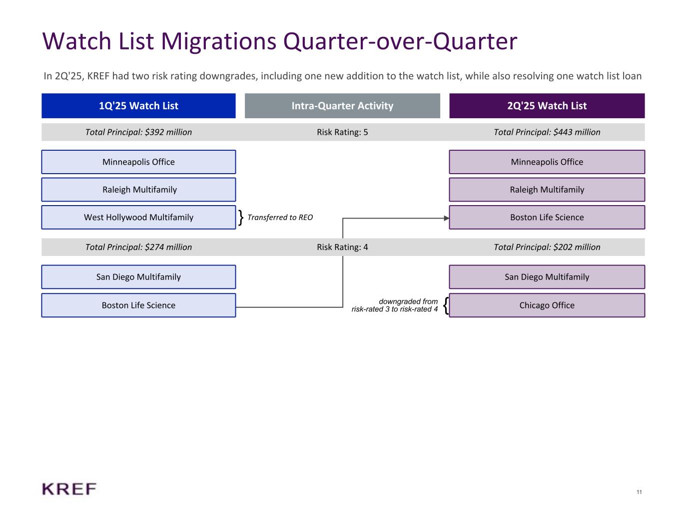 10 KREF Life Science Loan Portfolio Overview 100% of KREF's loan exposure is located in the top two Life Science markets Location MSA Investment Date Loan Purpose Development Status Year Built or Renovated Asset Quality Committed Principal Outstanding Principal Net Equity Loan per SF(1) Max Term (Years)(2) Boston, MA Boston Apr-21 Acquisition Complete 2022 Class A/B $166.2 $163.2 $41.8 $678 0.9 Risk-Rated 5: Total / Weighted Average $166.2 $163.2 $41.8 0.9 Boston, MA Boston Aug-22 Construction Complete 2024 Class A 312.5 229.6 33.6 747 2.1 Redwood City, CA San Francisco Sep-22 Construction In Process 2025 Class A 145.2 83.1 16.2 885 2.3 Cambridge, MA Boston Dec-21 Construction Complete 2023 Class A 115.7 97.6 25.1 1,072 1.5 Brisbane, CA San Francisco Jul-21 Refinance N/A 2020 Class A 91.3 83.8 23.8 724 3.1 San Carlos, CA San Francisco Feb-22 Recapitalization Complete 2023 Class A 89.1 58.6 20.1 400 2.4 Risk-Rated 3: Total / Weighted Average $753.8 $552.7 $118.8 2.2 Grand Total / Weighted Average $920.0 $715.9 $160.6 1.9 Completed 74% In Process 16% N/A 10% Boston 65% San Francisco 35% Life Science Assets Development Status(3) Metropolitan Statistical Area(3) Note: Amounts shown in millions, except for Loan per SF (1) Loan Per SF based on current principal amount divided by current SF. For Construction loans, Loan per SF based on total commitment amount of the loan divided by the proposed SF (2) Max remaining term (years) assumes all extension options are exercised, if applicable. Weighted average is weighted by current principal amount (3) Based on committed principal