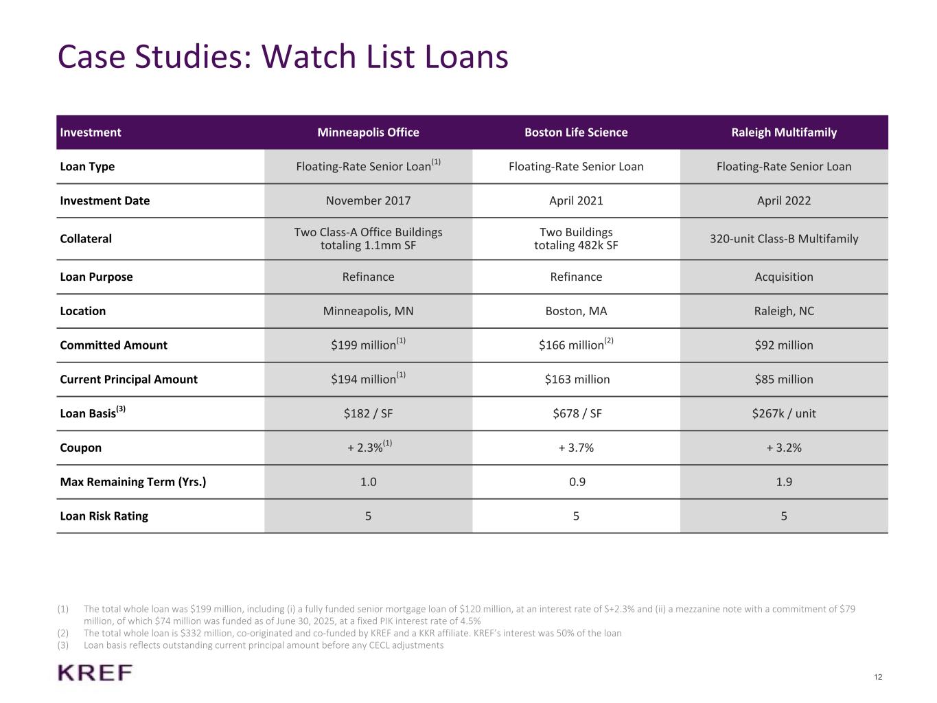 11 1Q'25 Watch List Intra-Quarter Activity 2Q'25 Watch List Total Principal: $392 million Risk Rating: 5 Total Principal: $443 million Minneapolis Office Minneapolis Office Raleigh Multifamily Raleigh Multifamily West Hollywood Multifamily } Transferred to REO Boston Life Science Total Principal: $274 million Risk Rating: 4 Total Principal: $202 million San Diego Multifamily San Diego Multifamily Boston Life Science downgraded from risk-rated 3 to risk-rated 4 { Chicago Office Watch List Migrations Quarter-over-Quarter In 2Q'25, KREF had two risk rating downgrades, including one new addition to the watch list, while also resolving one watch list loan