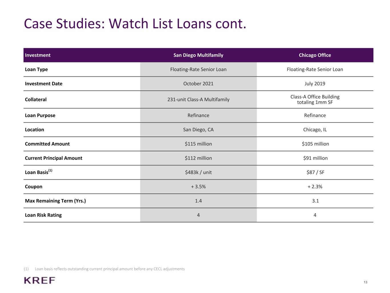 12 Case Studies: Watch List Loans Investment Minneapolis Office Boston Life Science Raleigh Multifamily Loan Type Floating-Rate Senior Loan(1) Floating-Rate Senior Loan Floating-Rate Senior Loan Investment Date November 2017 April 2021 April 2022 Collateral Two Class-A Office Buildings totaling 1.1mm SF Two Buildings totaling 482k SF 320-unit Class-B Multifamily Loan Purpose Refinance Refinance Acquisition Location Minneapolis, MN Boston, MA Raleigh, NC Committed Amount $199 million(1) $166 million(2) $92 million Current Principal Amount $194 million(1) $163 million $85 million Loan Basis(3) $182 / SF $678 / SF $267k / unit Coupon + 2.3%(1) + 3.7% + 3.2% Max Remaining Term (Yrs.) 1.0 0.9 1.9 Loan Risk Rating 5 5 5 (1) The total whole loan was $199 million, including (i) a fully funded senior mortgage loan of $120 million, at an interest rate of S+2.3% and (ii) a mezzanine note with a commitment of $79 million, of which $74 million was funded as of June 30, 2025, at a fixed PIK interest rate of 4.5% (2) The total whole loan is $332 million, co-originated and co-funded by KREF and a KKR affiliate. KREF’s interest was 50% of the loan (3) Loan basis reflects outstanding current principal amount before any CECL adjustments