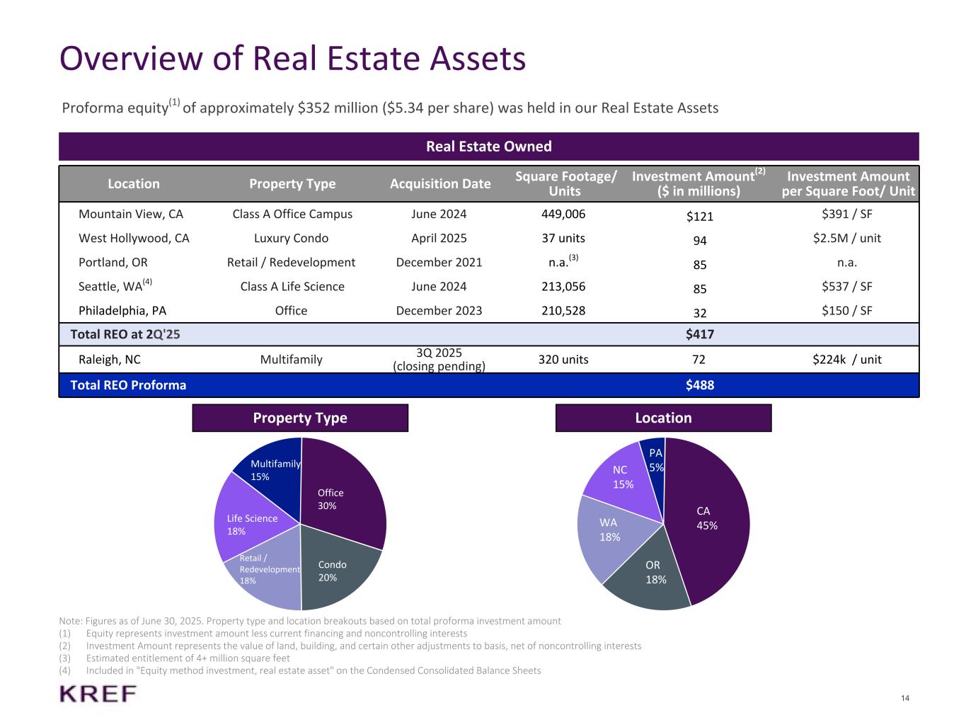 14 Overview of Real Estate Assets Real Estate Owned Location Property Type Acquisition Date Square Footage/ Units Investment Amount(2) ($ in millions) Investment Amount per Square Foot/ Unit Mountain View, CA Class A Office Campus June 2024 449,006 $121 $391 / SF West Hollywood, CA Luxury Condo April 2025 37 units 94 $2.5M / unit Portland, OR Retail / Redevelopment December 2021 n.a.(3) 85 n.a. Seattle, WA(4) Class A Life Science June 2024 213,056 85 $537 / SF Philadelphia, PA Office December 2023 210,528 32 $150 / SF Total REO at 2Q'25 $417 Raleigh, NC Multifamily 3Q 2025 (closing pending) 320 units 72 $224k / unit Total REO Proforma $488 Note: Figures as of June 30, 2025. Property type and location breakouts based on total proforma investment amount (1) Equity represents investment amount less current financing and noncontrolling interests (2) Investment Amount represents the value of land, building, and certain other adjustments to basis, net of noncontrolling interests (3) Estimated entitlement of 4+ million square feet (4) Included in "Equity method investment, real estate asset" on the Condensed Consolidated Balance Sheets Proforma equity(1) of approximately $352 million ($5.34 per share) was held in our Real Estate Assets Office 30% Condo 20% Retail / Redevelopment 18% Life Science 18% Multifamily 15% CA 45% OR 18% WA 18% NC 15% PA 5% Property Type Location