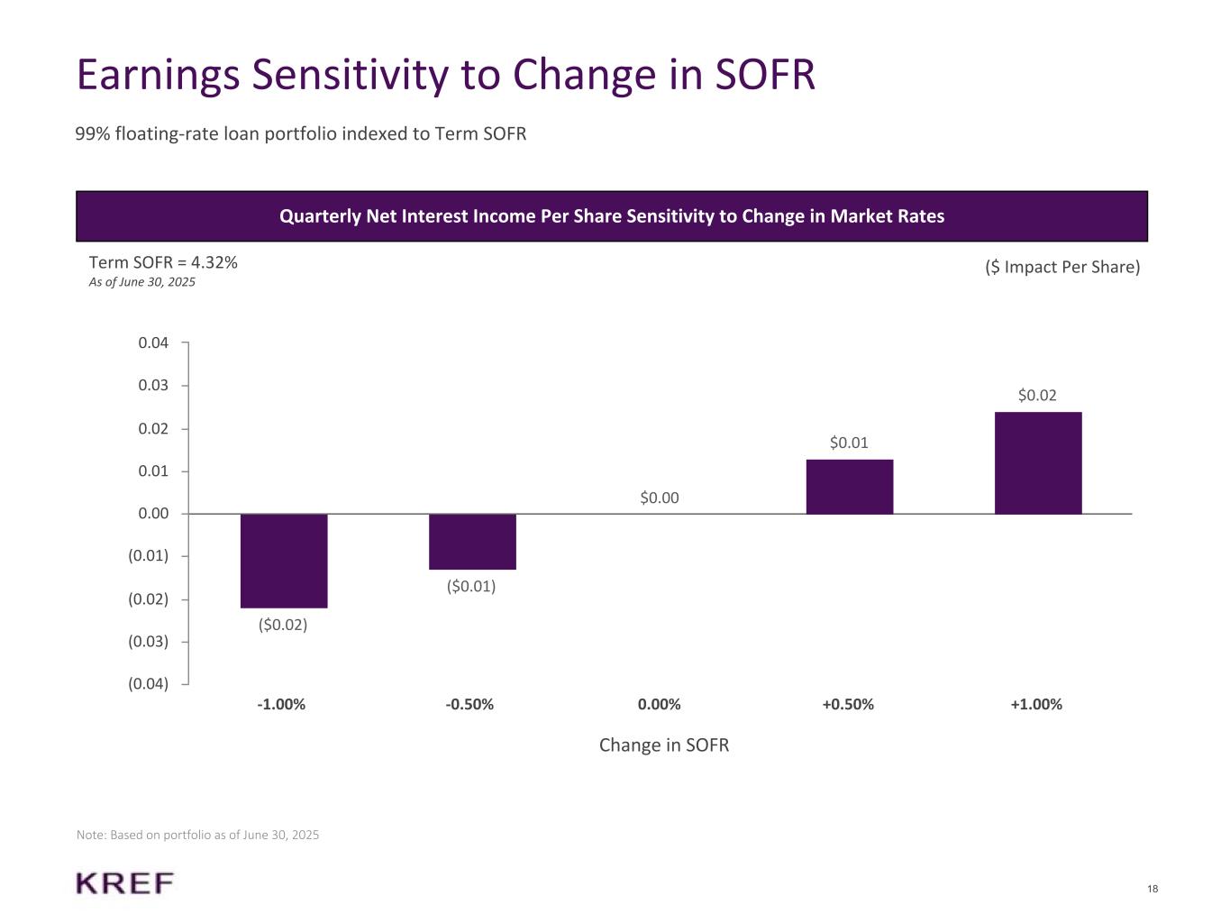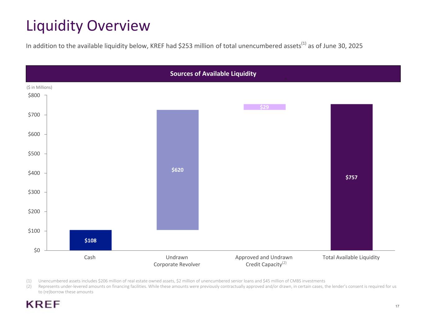 17 $108 $728 $108 $620 $29 $757 Cash Undrawn Corporate Revolver Approved and Undrawn Credit Capacity Total Available Liquidity $0 $100 $200 $300 $400 $500 $600 $700 $800 Liquidity Overview (1) Unencumbered assets includes $206 million of real estate owned assets, $2 million of unencumbered senior loans and $45 million of CMBS investments (2) Represents under-levered amounts on financing facilities. While these amounts were previously contractually approved and/or drawn, in certain cases, the lender’s consent is required for us to (re)borrow these amounts ($ in Millions) Sources of Available Liquidity In addition to the available liquidity below, KREF had $253 million of total unencumbered assets(1) as of June 30, 2025 (4) (2)