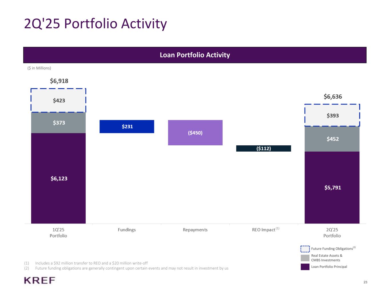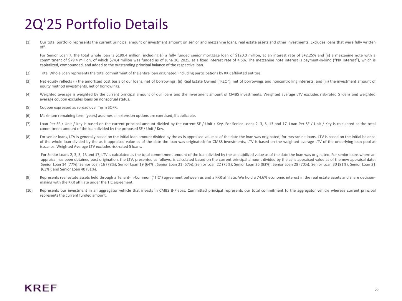 22 2Q'25 Portfolio Details (1) Our total portfolio represents the current principal amount or investment amount on senior and mezzanine loans, real estate assets and other investments. Excludes loans that were fully written off. For Senior Loan 7, the total whole loan is $199.4 million, including (i) a fully funded senior mortgage loan of $120.0 million, at an interest rate of S+2.25% and (ii) a mezzanine note with a commitment of $79.4 million, of which $74.4 million was funded as of June 30, 2025, at a fixed interest rate of 4.5%. The mezzanine note interest is payment-in-kind (“PIK Interest”), which is capitalized, compounded, and added to the outstanding principal balance of the respective loan. (2) Total Whole Loan represents the total commitment of the entire loan originated, including participations by KKR affiliated entities. (3) Net equity reflects (i) the amortized cost basis of our loans, net of borrowings; (ii) Real Estate Owned ("REO"), net of borrowings and noncontrolling interests, and (iii) the investment amount of equity method investments, net of borrowings. (4) Weighted average is weighted by the current principal amount of our loans and the investment amount of CMBS investments. Weighted average LTV excludes risk-rated 5 loans and weighted average coupon excludes loans on nonaccrual status. (5) Coupon expressed as spread over Term SOFR. (6) Maximum remaining term (years) assumes all extension options are exercised, if applicable. (7) Loan Per SF / Unit / Key is based on the current principal amount divided by the current SF / Unit / Key. For Senior Loans 2, 3, 5, 13 and 17, Loan Per SF / Unit / Key is calculated as the total commitment amount of the loan divided by the proposed SF / Unit / Key. (8) For senior loans, LTV is generally based on the initial loan amount divided by the as-is appraised value as of the date the loan was originated; for mezzanine loans, LTV is based on the initial balance of the whole loan divided by the as-is appraised value as of the date the loan was originated; for CMBS investments, LTV is based on the weighted average LTV of the underlying loan pool at issuance. Weighted Average LTV excludes risk-rated 5 loans. For Senior Loans 2, 3, 5, 13 and 17, LTV is calculated as the total commitment amount of the loan divided by the as-stabilized value as of the date the loan was originated. For senior loans where an appraisal has been obtained post origination, the LTV, presented as follows, is calculated based on the current principal amount divided by the as-is appraised value as of the new appraisal date: Senior Loan 14 (77%); Senior Loan 16 (78%); Senior Loan 19 (64%); Senior Loan 21 (57%); Senior Loan 22 (75%); Senior Loan 26 (83%); Senior Loan 28 (70%); Senior Loan 30 (81%); Senior Loan 31 (63%); and Senior Loan 40 (81%). (9) Represents real estate assets held through a Tenant-in-Common ("TIC") agreement between us and a KKR affiliate. We hold a 74.6% economic interest in the real estate assets and share decision- making with the KKR affiliate under the TIC agreement. (10) Represents our investment in an aggregator vehicle that invests in CMBS B-Pieces. Committed principal represents our total commitment to the aggregator vehicle whereas current principal represents the current funded amount.