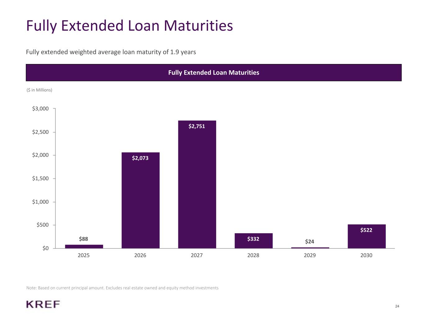 23 2Q'25 Portfolio Activity (1) Includes a $92 million transfer to REO and a $20 million write-off (2) Future funding obligations are generally contingent upon certain events and may not result in investment by us Loan Portfolio Activity Future Funding Obligations(2) ($ in Millions) Real Estate Assets & CMBS Investments Loan Portfolio Principal (1)