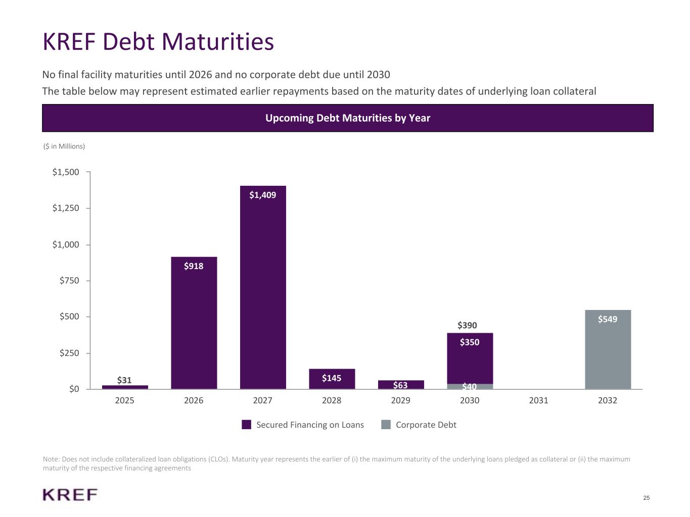 25 KREF Debt Maturities Note: Does not include collateralized loan obligations (CLOs). Maturity year represents the earlier of (i) the maximum maturity of the underlying loans pledged as collateral or (ii) the maximum maturity of the respective financing agreements Upcoming Debt Maturities by Year ($ in Millions) $0 $0 $0 $0 $0 $40 $0 $549 $31 $918 $1,409 $145 $63 $350 Secured Financing on Loans Corporate Debt 2025 2026 2027 2028 2029 2030 2031 2032 $0 $250 $500 $750 $1,000 $1,250 $1,500 No final facility maturities until 2026 and no corporate debt due until 2030 The table below may represent estimated earlier repayments based on the maturity dates of underlying loan collateral $390