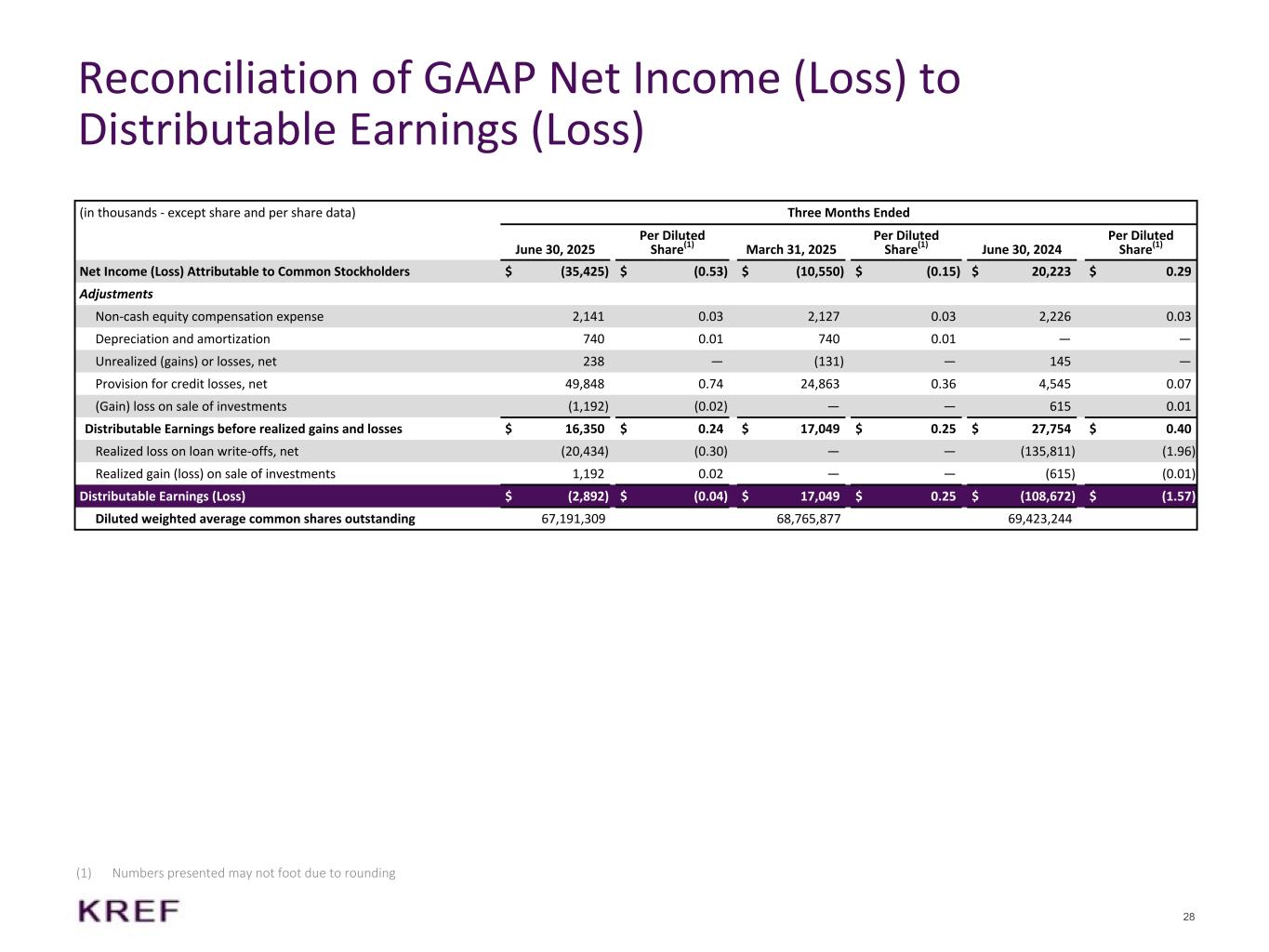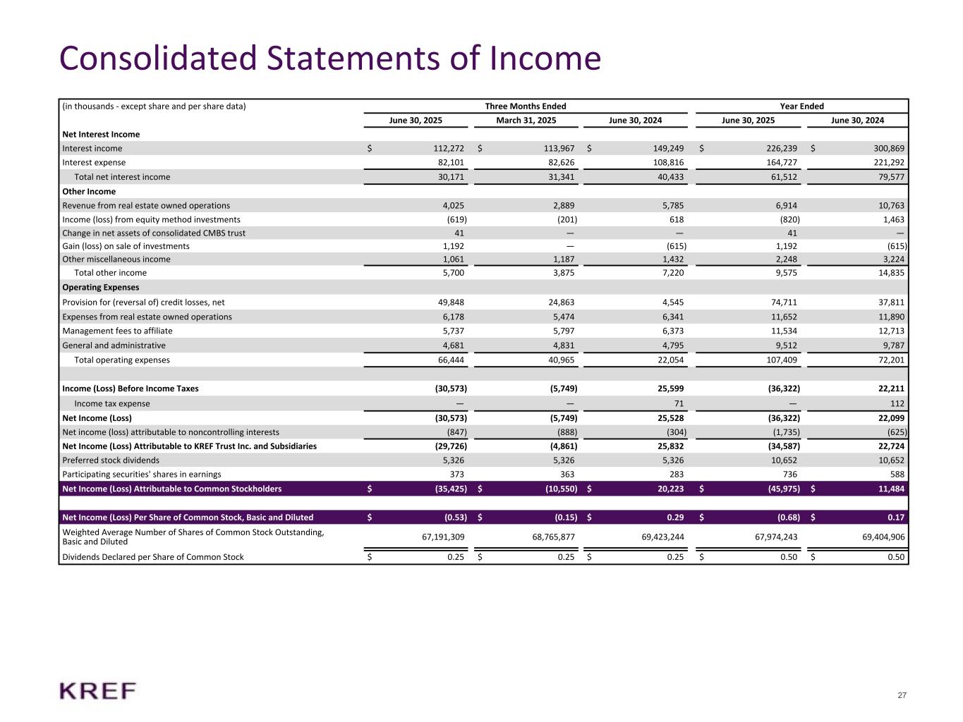 27 Consolidated Statements of Income (in thousands - except share and per share data) Three Months Ended Year Ended June 30, 2025 March 31, 2025 June 30, 2024 June 30, 2025 June 30, 2024 Net Interest Income Interest income $ 112,272 $ 113,967 $ 149,249 $ 226,239 $ 300,869 Interest expense 82,101 82,626 108,816 164,727 221,292 Total net interest income 30,171 31,341 40,433 61,512 79,577 Other Income Revenue from real estate owned operations 4,025 2,889 5,785 6,914 10,763 Income (loss) from equity method investments (619) (201) 618 (820) 1,463 Change in net assets of consolidated CMBS trust 41 — — 41 — Gain (loss) on sale of investments 1,192 — (615) 1,192 (615) Other miscellaneous income 1,061 1,187 1,432 2,248 3,224 Total other income 5,700 3,875 7,220 9,575 14,835 Operating Expenses Provision for (reversal of) credit losses, net 49,848 24,863 4,545 74,711 37,811 Expenses from real estate owned operations 6,178 5,474 6,341 11,652 11,890 Management fees to affiliate 5,737 5,797 6,373 11,534 12,713 General and administrative 4,681 4,831 4,795 9,512 9,787 Total operating expenses 66,444 40,965 22,054 107,409 72,201 Income (Loss) Before Income Taxes (30,573) (5,749) 25,599 (36,322) 22,211 Income tax expense — — 71 — 112 Net Income (Loss) (30,573) (5,749) 25,528 (36,322) 22,099 Net income (loss) attributable to noncontrolling interests (847) (888) (304) (1,735) (625) Net Income (Loss) Attributable to KREF Trust Inc. and Subsidiaries (29,726) (4,861) 25,832 (34,587) 22,724 Preferred stock dividends 5,326 5,326 5,326 10,652 10,652 Participating securities' shares in earnings 373 363 283 736 588 Net Income (Loss) Attributable to Common Stockholders $ (35,425) $ (10,550) $ 20,223 $ (45,975) $ 11,484 Net Income (Loss) Per Share of Common Stock, Basic and Diluted $ (0.53) $ (0.15) $ 0.29 $ (0.68) $ 0.17 Weighted Average Number of Shares of Common Stock Outstanding, Basic and Diluted 67,191,309 68,765,877 69,423,244 67,974,243 69,404,906 Dividends Declared per Share of Common Stock $ 0.25 $ 0.25 $ 0.25 $ 0.50 $ 0.50