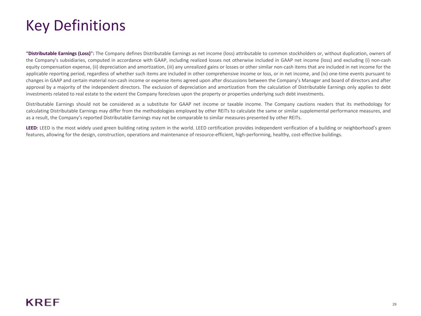 29 Key Definitions “Distributable Earnings (Loss)": The Company defines Distributable Earnings as net income (loss) attributable to common stockholders or, without duplication, owners of the Company's subsidiaries, computed in accordance with GAAP, including realized losses not otherwise included in GAAP net income (loss) and excluding (i) non-cash equity compensation expense, (ii) depreciation and amortization, (iii) any unrealized gains or losses or other similar non-cash items that are included in net income for the applicable reporting period, regardless of whether such items are included in other comprehensive income or loss, or in net income, and (iv) one-time events pursuant to changes in GAAP and certain material non-cash income or expense items agreed upon after discussions between the Company’s Manager and board of directors and after approval by a majority of the independent directors. The exclusion of depreciation and amortization from the calculation of Distributable Earnings only applies to debt investments related to real estate to the extent the Company forecloses upon the property or properties underlying such debt investments. Distributable Earnings should not be considered as a substitute for GAAP net income or taxable income. The Company cautions readers that its methodology for calculating Distributable Earnings may differ from the methodologies employed by other REITs to calculate the same or similar supplemental performance measures, and as a result, the Company’s reported Distributable Earnings may not be comparable to similar measures presented by other REITs. LEED: LEED is the most widely used green building rating system in the world. LEED certification provides independent verification of a building or neighborhood’s green features, allowing for the design, construction, operations and maintenance of resource-efficient, high-performing, healthy, cost-effective buildings.