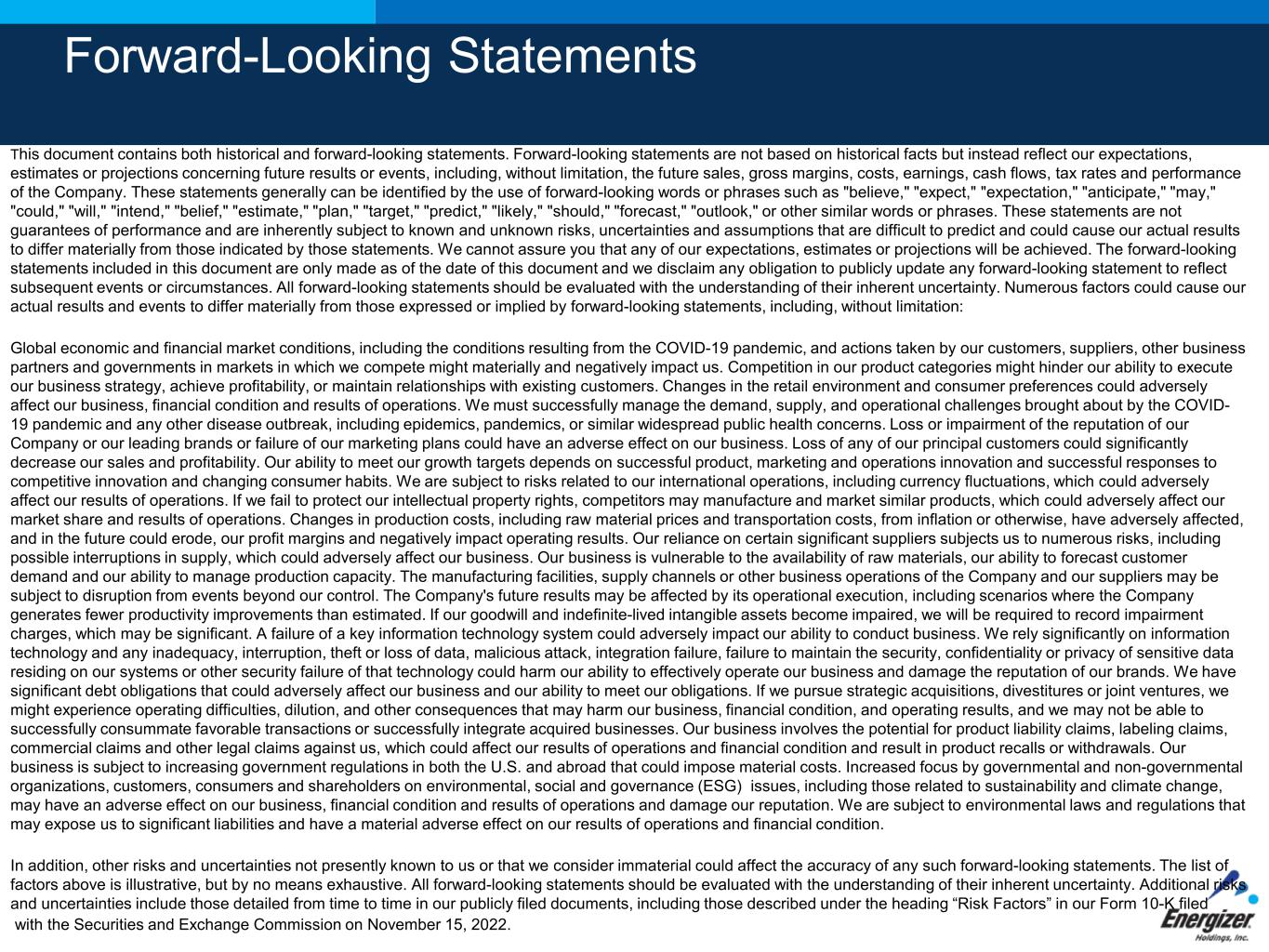 This document contains both historical and forward-looking statements. Forward-looking statements are not based on historical facts but instead reflect our expectations, estimates or projections concerning future results or events, including, without limitation, the future sales, gross margins, costs, earnings, cash flows, tax rates and performance of the Company. These statements generally can be identified by the use of forward-looking words or phrases such as "believe," "expect," "expectation," "anticipate," "may," "could," "will," "intend," "belief," "estimate," "plan," "target," "predict," "likely," "should," "forecast," "outlook," or other similar words or phrases. These statements are not guarantees of performance and are inherently subject to known and unknown risks, uncertainties and assumptions that are difficult to predict and could cause our actual results to differ materially from those indicated by those statements. We cannot assure you that any of our expectations, estimates or projections will be achieved. The forward-looking statements included in this document are only made as of the date of this document and we disclaim any obligation to publicly update any forward-looking statement to reflect subsequent events or circumstances. All forward-looking statements should be evaluated with the understanding of their inherent uncertainty. Numerous factors could cause our actual results and events to differ materially from those expressed or implied by forward-looking statements, including, without limitation: Global economic and financial market conditions, including the conditions resulting from the COVID-19 pandemic, and actions taken by our customers, suppliers, other business partners and governments in markets in which we compete might materially and negatively impact us. Competition in our product categories might hinder our ability to execute our business strategy, achieve profitability, or maintain relationships with existing customers. Changes in the retail environment and consumer preferences could adversely affect our business, financial condition and results of operations. We must successfully manage the demand, supply, and operational challenges brought about by the COVID- 19 pandemic and any other disease outbreak, including epidemics, pandemics, or similar widespread public health concerns. Loss or impairment of the reputation of our Company or our leading brands or failure of our marketing plans could have an adverse effect on our business. Loss of any of our principal customers could significantly decrease our sales and profitability. Our ability to meet our growth targets depends on successful product, marketing and operations innovation and successful responses to competitive innovation and changing consumer habits. We are subject to risks related to our international operations, including currency fluctuations, which could adversely affect our results of operations. If we fail to protect our intellectual property rights, competitors may manufacture and market similar products, which could adversely affect our market share and results of operations. Changes in production costs, including raw material prices and transportation costs, from inflation or otherwise, have adversely affected, and in the future could erode, our profit margins and negatively impact operating results. Our reliance on certain significant suppliers subjects us to numerous risks, including possible interruptions in supply, which could adversely affect our business. Our business is vulnerable to the availability of raw materials, our ability to forecast customer demand and our ability to manage production capacity. The manufacturing facilities, supply channels or other business operations of the Company and our suppliers may be subject to disruption from events beyond our control. The Company's future results may be affected by its operational execution, including scenarios where the Company generates fewer productivity improvements than estimated. If our goodwill and indefinite-lived intangible assets become impaired, we will be required to record impairment charges, which may be significant. A failure of a key information technology system could adversely impact our ability to conduct business. We rely significantly on information technology and any inadequacy, interruption, theft or loss of data, malicious attack, integration failure, failure to maintain the security, confidentiality or privacy of sensitive data residing on our systems or other security failure of that technology could harm our ability to effectively operate our business and damage the reputation of our brands. We have significant debt obligations that could adversely affect our business and our ability to meet our obligations. If we pursue strategic acquisitions, divestitures or joint ventures, we might experience operating difficulties, dilution, and other consequences that may harm our business, financial condition, and operating results, and we may not be able to successfully consummate favorable transactions or successfully integrate acquired businesses. Our business involves the potential for product liability claims, labeling claims, commercial claims and other legal claims against us, which could affect our results of operations and financial condition and result in product recalls or withdrawals. Our business is subject to increasing government regulations in both the U.S. and abroad that could impose material costs. Increased focus by governmental and non-governmental organizations, customers, consumers and shareholders on environmental, social and governance (ESG) issues, including those related to sustainability and climate change, may have an adverse effect on our business, financial condition and results of operations and damage our reputation. We are subject to environmental laws and regulations that may expose us to significant liabilities and have a material adverse effect on our results of operations