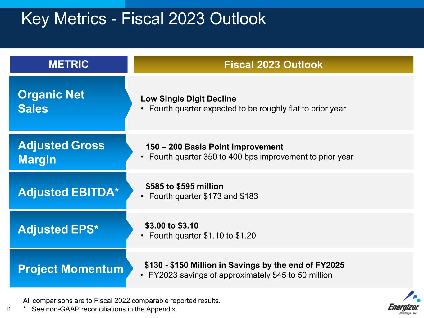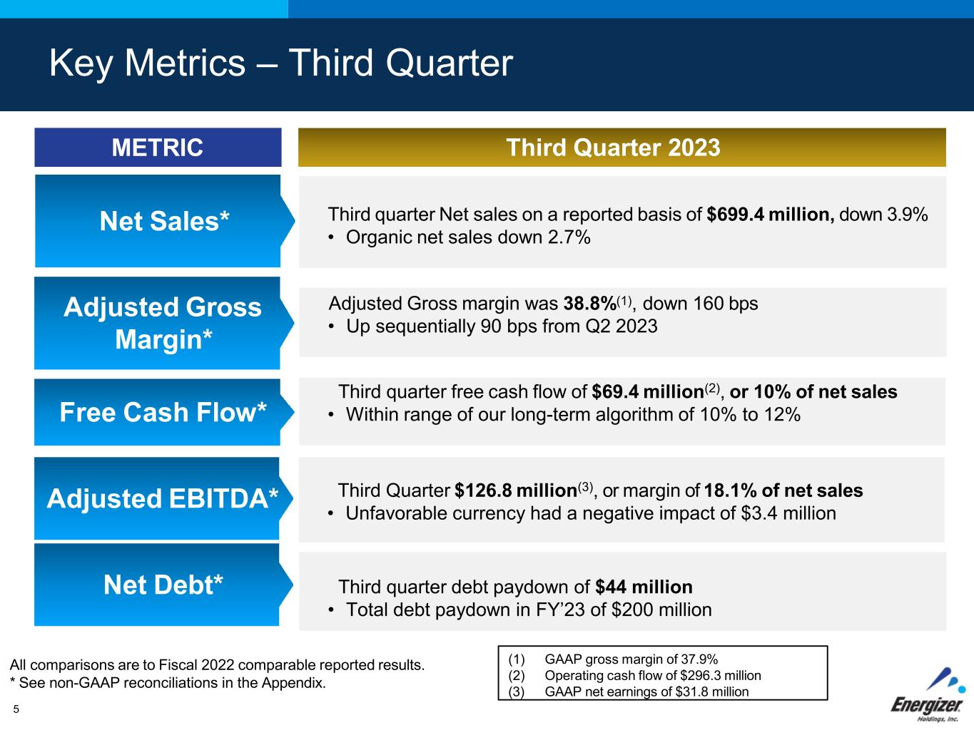 Non-GAAP Financial Measures The Company reports its financial results in accordance with accounting principles generally accepted in the U.S. ("GAAP"). However, management believes that certain non- GAAP financial measures provide users with additional meaningful comparisons to the corresponding historical or future period, and are used for management incentive compensation. These non-GAAP financial measures exclude items that are not reflective of the Company's on-going operating performance, such as restructuring and related costs, acquisition and integration costs, an acquisition earn out, the loss/(gain) on extinguishment of debt, the costs of the May 2022 flooding of our Brazilian manufacturing facility, the gain on finance lease termination, and the costs of exiting the Russian market. In addition, these measures help investors to analyze year over year comparability when excluding currency fluctuations as well as other Company initiatives that are not on-going. We believe these non-GAAP financial measures are an enhancement to assist investors in understanding our business and in performing analysis consistent with financial models developed by research analysts. Investors should consider non-GAAP measures in addition to, not as a substitute for, or superior to, the comparable GAAP measures. In addition, these non-GAAP measures may not be the same as similar measures used by other companies due to possible differences in methods and in the items being adjusted. We provide the following non-GAAP measures and calculations, as well as the corresponding reconciliation to the closest GAAP measure in the following supplemental schedules: • Adjusted Net Earnings and Adjusted Diluted Net Earnings Per Common Share (EPS). These measures exclude the impact of the costs related to acquisition and integration, restructuring and related costs, an acquisition earn out, the loss/(gain) on extinguishment of debt, the costs of the flooding of our Brazilian manufacturing facility, the gain on finance lease termination and the costs of exiting the Russian market. • Non-GAAP Tax Rate. This is the tax rate when excluding the pre-tax impact of acquisition and integration costs, restructuring and related costs, an acquisition earn out, the loss/(gain) on extinguishment of debt, the costs of the flooding of our Brazilian manufacturing facility, the gain on finance lease termination, and the costs of exiting the Russian market, as well as the related tax impact for these items, calculated utilizing the statutory rate for where the impact was incurred. • Organic. This is the non-GAAP financial measurement of the change in revenue or segment profit that excludes or otherwise adjusts for the change in Russia and Argentina operations and impact of currency from the changes in foreign currency exchange rates as defined below: • Change in Russia Operations. The Company exited the Russian market in the second quarter of fiscal 2022 due to the increased global and economic and political uncertainty resulting from the ongoing conflict between Russia and Ukraine. This adjusts for the change in Russian sales and segment profit from the prior year post exit. • Change in Argentina Operations. The Company is presenting separately all changes in sales and segment profit from our Argentina affiliate due to the designation of the economy as highly inflationary as of July 1, 2018. • Impact of Currency. The Company evaluates the operating performance of our Company on a currency neutral basis. The Impact of Currency is the change in foreign currency exchange rates year-over-year on reported results, which is calculated by comparing the value of current year foreign operations at the current period USD exchange rate versus the value of current year foreign operations at the prior period USD exchange rate. The impact of currency also includes gains/(losses) of currency hedging programs, and it excludes hyper-inflationary markets. • Adjusted Comparisons. Detail for adjusted gross profit and adjusted gross margin are also supplemental non-GAAP measure disclosures. These measures exclude the impact of costs related to acquisition and integration, restructuring and related costs, an acquisition earn out, the costs of the flooding of our Brazilian manufacturing facility, the gain on finance lease termination, and the costs of exiting the Russian market. • EBITDA and Adjusted EBITDA. EBITDA is defined as net earnings before income tax provision, interest, the loss/(gain) on extinguishment of debt, and depreciation and amortization. Adjusted EBITDA further excludes the impact of the costs related to restructuring, exiting the Russian market, gains on finance lease termination, the costs of the flooding of our manufacturing facility in Brazil, impairment of goodwill and other intangible assets, and share based payments. • Free Cash Flow. Free Cash Flow is defined as net cash provided by operating activities reduced by capital expenditures, net of the proceeds from asset sales. • Net Debt. Net Debt is defined as total Company debt, less cash and cash equivalents. • Currency-neutral. Currency-neutral excludes the Impact of Currency as defined above on key measures. Hyper inflationary markets are excluded from this calculation.