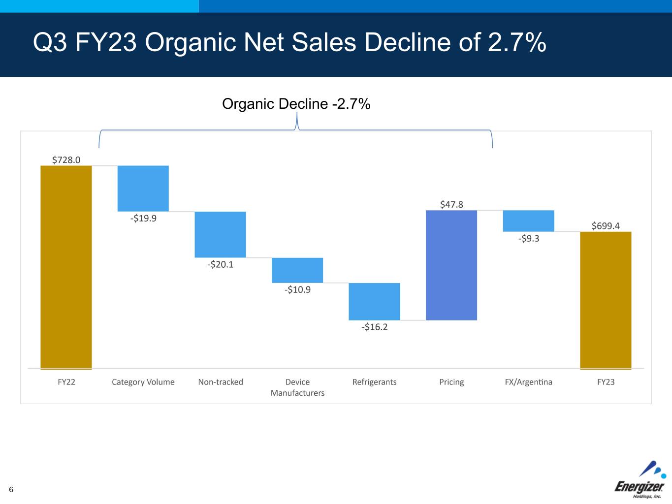 Q3 FY23 Organic Net Sales Decline of 2.7% Organic Decline -2.7% 6