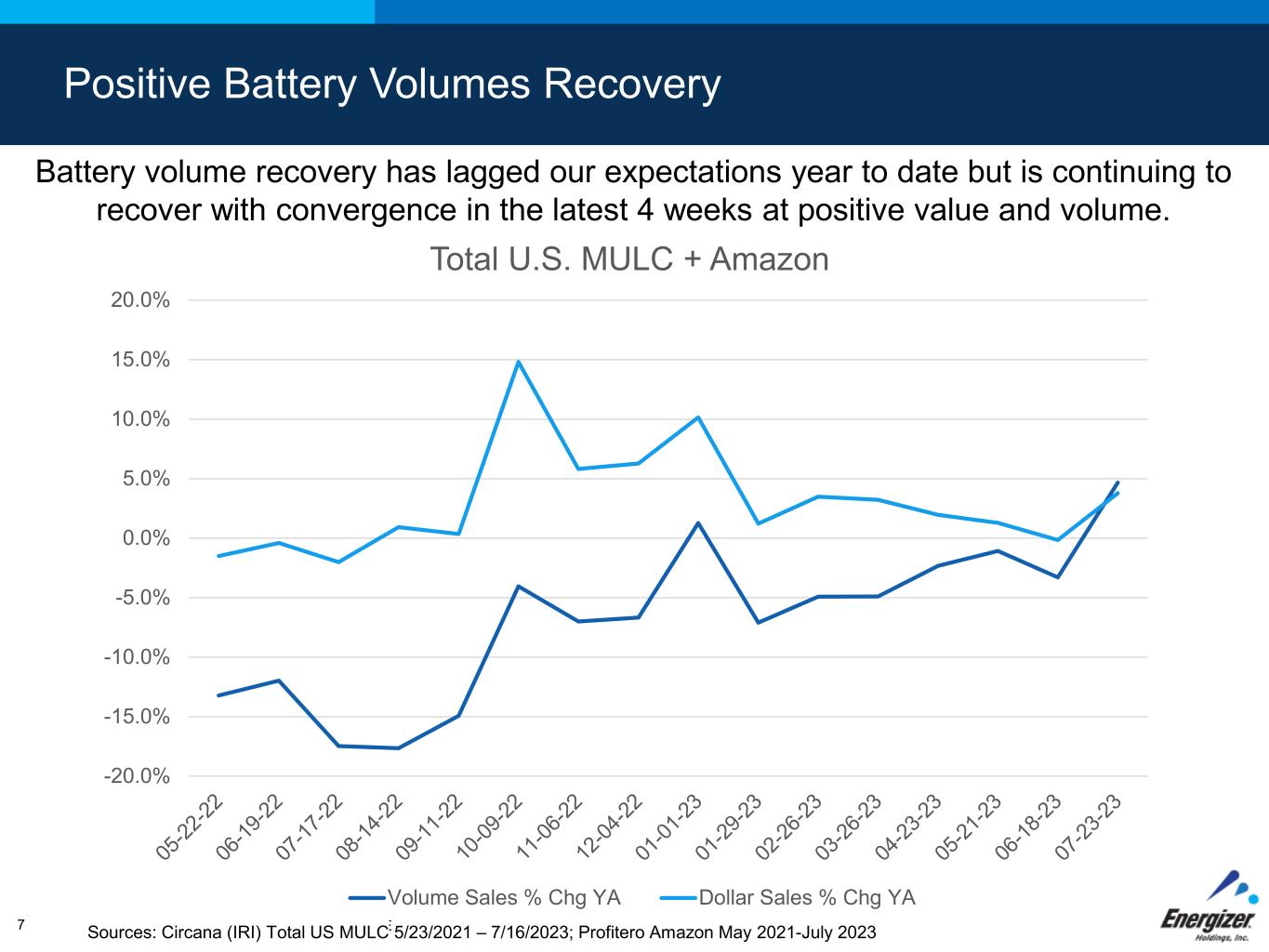 FOR INTERNAL USE ONLY – DO NOT DISTRIBUTE Positive Battery Volumes Recovery -20.0% -15.0% -10.0% -5.0% 0.0% 5.0% 10.0% 15.0% 20.0% Total U.S. MULC + Amazon Volume Sales % Chg YA Dollar Sales % Chg YA Sources: Circana (IRI) Total US MULC 5/23/2021 – 7/16/2023; Profitero Amazon May 2021-July 2023 Battery volume recovery has lagged our expectations year to date but is continuing to recover with convergence in the latest 4 weeks at positive value and volume. 7