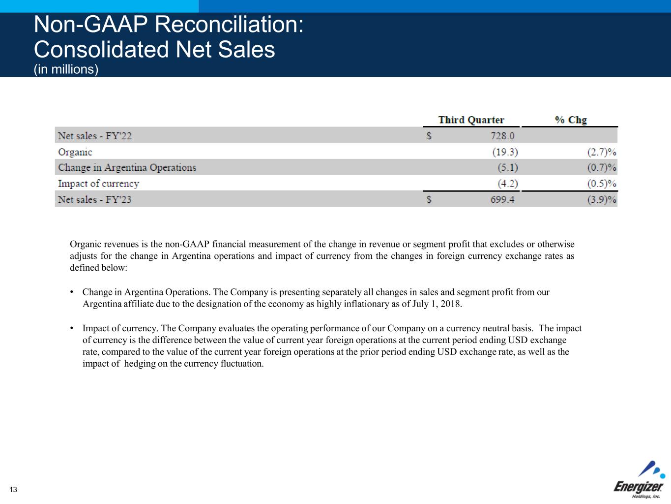 Non-GAAP Reconciliation: Consolidated Net Sales (in millions) Organic revenues is the non-GAAP financial measurement of the change in revenue or segment profit that excludes or otherwise adjusts for the change in Argentina operations and impact of currency from the changes in foreign currency exchange rates as defined below: • Change in Argentina Operations. The Company is presenting separately all changes in sales and segment profit from our Argentina affiliate due to the designation of the economy as highly inflationary as of July 1, 2018. • Impact of currency. The Company evaluates the operating performance of our Company on a currency neutral basis. The impact of currency is the difference between the value of current year foreign operations at the current period ending USD exchange rate, compared to the value of the current year foreign operations at the prior period ending USD exchange rate, as well as the impact of hedging on the currency fluctuation. 13