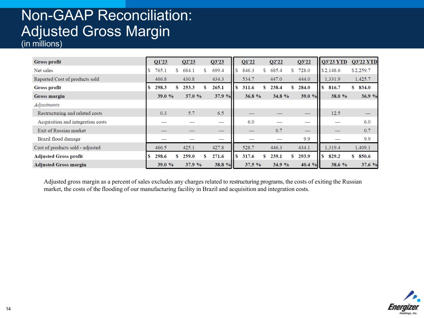 Non-GAAP Reconciliation: Adjusted Gross Margin (in millions) Adjusted gross margin as a percent of sales excludes any charges related to restructuring programs, the costs of exiting the Russian market, the costs of the flooding of our manufacturing facility in Brazil and acquisition and integration costs. 14