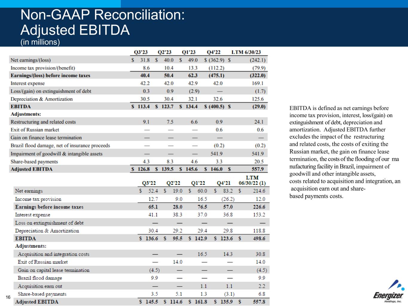 Non-GAAP Reconciliation: Adjusted EBITDA (in millions) EBITDA is defined as net earnings before income tax provision, interest, loss/(gain) on extinguishment of debt, depreciation and amortization. Adjusted EBITDA further excludes the impact of the restructuring and related costs, the costs of exiting the Russian market, the gain on finance lease termination, the costs of the flooding of our ma nufacturing facility in Brazil, impairment of goodwill and other intangible assets, costs related to acquisition and integration, an acquisition earn out and share- based payments costs. 16