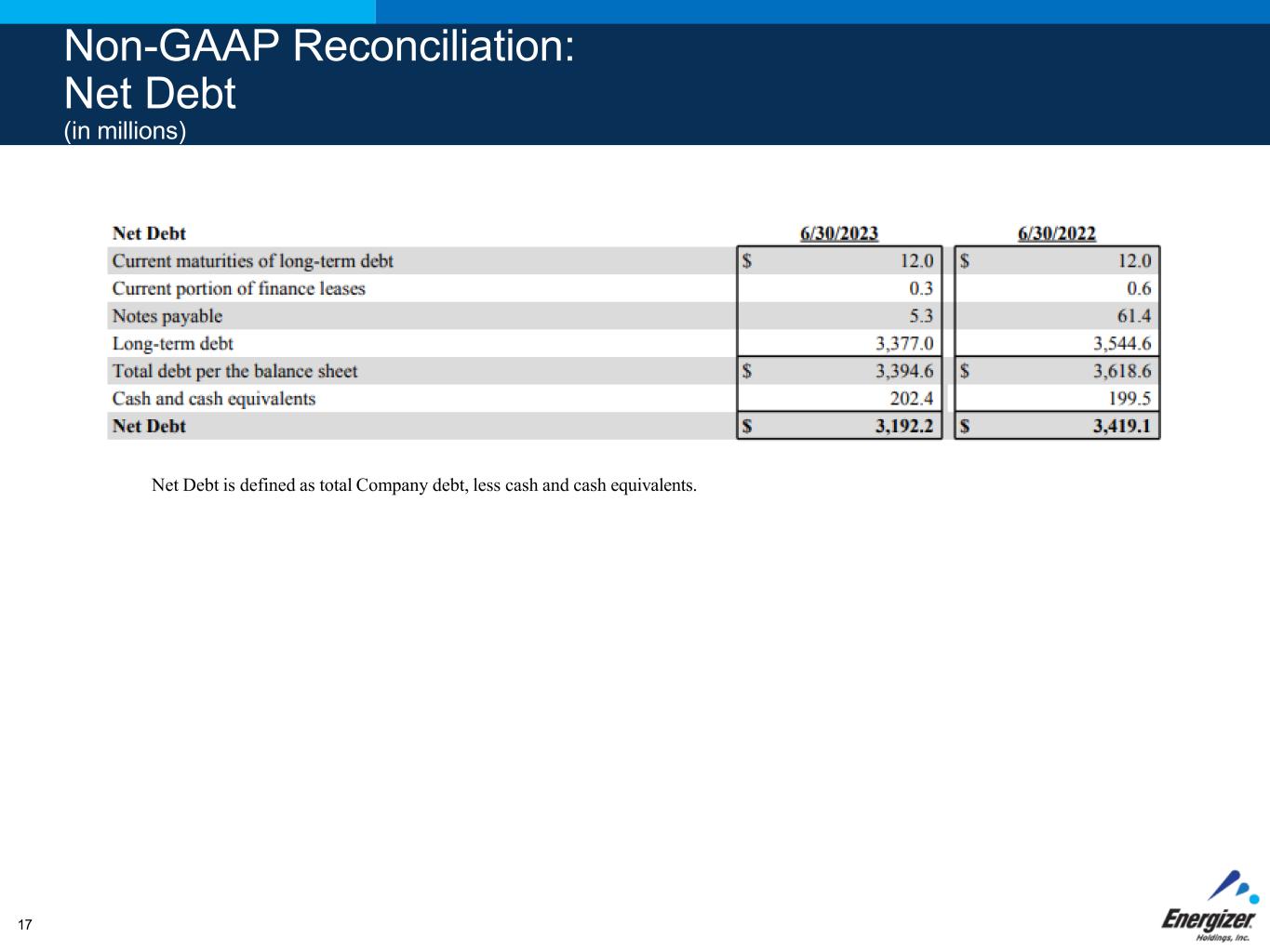 Non-GAAP Reconciliation: Net Debt (in millions) Net Debt is defined as total Company debt, less cash and cash equivalents. 17