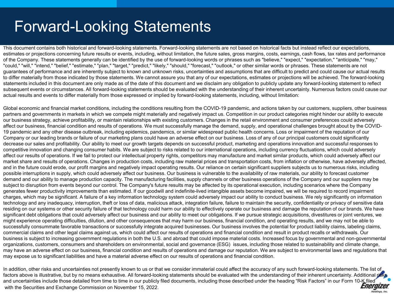This document contains both historical and forward-looking statements. Forward-looking statements are not based on historical facts but instead reflect our expectations, estimates or projections concerning future results or events, including, without limitation, the future sales, gross margins, costs, earnings, cash flows, tax rates and performance of the Company. These statements generally can be identified by the use of forward-looking words or phrases such as "believe," "expect," "expectation," "anticipate," "may," "could," "will," "intend," "belief," "estimate," "plan," "target," "predict," "likely," "should," "forecast," "outlook," or other similar words or phrases. These statements are not guarantees of performance and are inherently subject to known and unknown risks, uncertainties and assumptions that are difficult to predict and could cause our actual results to differ materially from those indicated by those statements. We cannot assure you that any of our expectations, estimates or projections will be achieved. The forward-looking statements included in this document are only made as of the date of this document and we disclaim any obligation to publicly update any forward-looking statement to reflect subsequent events or circumstances. All forward-looking statements should be evaluated with the understanding of their inherent uncertainty. Numerous factors could cause our actual results and events to differ materially from those expressed or implied by forward-looking statements, including, without limitation: Global economic and financial market conditions, including the conditions resulting from the COVID-19 pandemic, and actions taken by our customers, suppliers, other business partners and governments in markets in which we compete might materially and negatively impact us. Competition in our product categories might hinder our ability to execute our business strategy, achieve profitability, or maintain relationships with existing customers. Changes in the retail environment and consumer preferences could adversely affect our business, financial condition and results of operations. We must successfully manage the demand, supply, and operational challenges brought about by the COVID- 19 pandemic and any other disease outbreak, including epidemics, pandemics, or similar widespread public health concerns. Loss or impairment of the reputation of our Company or our leading brands or failure of our marketing plans could have an adverse effect on our business. Loss of any of our principal customers could significantly decrease our sales and profitability. Our ability to meet our growth targets depends on successful product, marketing and operations innovation and successful responses to competitive innovation and changing consumer habits. We are subject to risks related to our international operations, including currency fluctuations, which could adversely affect our results of operations. If we fail to protect our intellectual property rights, competitors may manufacture and market similar products, which could adversely affect our market share and results of operations. Changes in production costs, including raw material prices and transportation costs, from inflation or otherwise, have adversely affected, and in the future could erode, our profit margins and negatively impact operating results. Our reliance on certain significant suppliers subjects us to numerous risks, including possible interruptions in supply, which could adversely affect our business. Our business is vulnerable to the availability of raw materials, our ability to forecast customer demand and our ability to manage production capacity. The manufacturing facilities, supply channels or other business operations of the Company and our suppliers may be subject to disruption from events beyond our control. The Company's future results may be affected by its operational execution, including scenarios where the Company generates fewer productivity improvements than estimated. If our goodwill and indefinite-lived intangible assets become impaired, we will be required to record impairment charges, which may be significant. A failure of a key information technology system could adversely impact our ability to conduct business. We rely significantly on information technology and any inadequacy, interruption, theft or loss of data, malicious attack, integration failure, failure to maintain the security, confidentiality or privacy of sensitive data residing on our systems or other security failure of that technology could harm our ability to effectively operate our business and damage the reputation of our brands. We have significant debt obligations that could adversely affect our business and our ability to meet our obligations. If we pursue strategic acquisitions, divestitures or joint ventures, we might experience operating difficulties, dilution, and other consequences that may harm our business, financial condition, and operating results, and we may not be able to successfully consummate favorable transactions or successfully integrate acquired businesses. Our business involves the potential for product liability claims, labeling claims, commercial claims and other legal claims against us, which could affect our results of operations and financial condition and result in product recalls or withdrawals. Our business is subject to increasing government regulations in both the U.S. and abroad that could impose material costs. Increased focus by governmental and non-governmental organizations, customers, consumers and shareholders on environmental, social and governance (ESG) issues, including those related to sustainability and climate change, may have an adverse effect on our business, financial condition and results of operations and damage our reputation. We are subject to environmental laws and regulations that may expose us to significant liabilities and have a material adverse effect on our results of operations