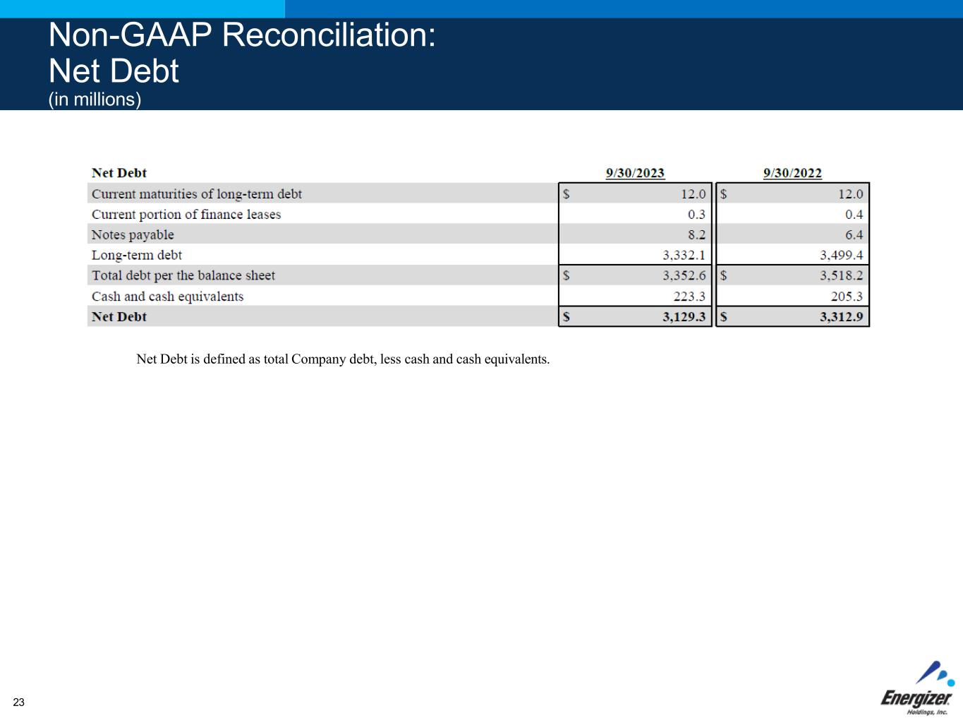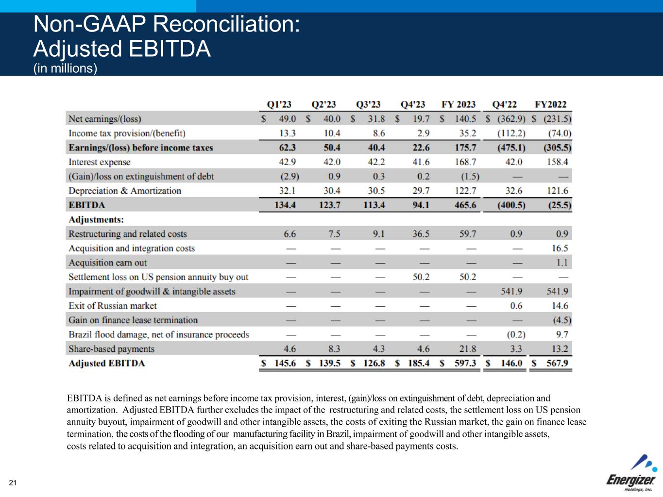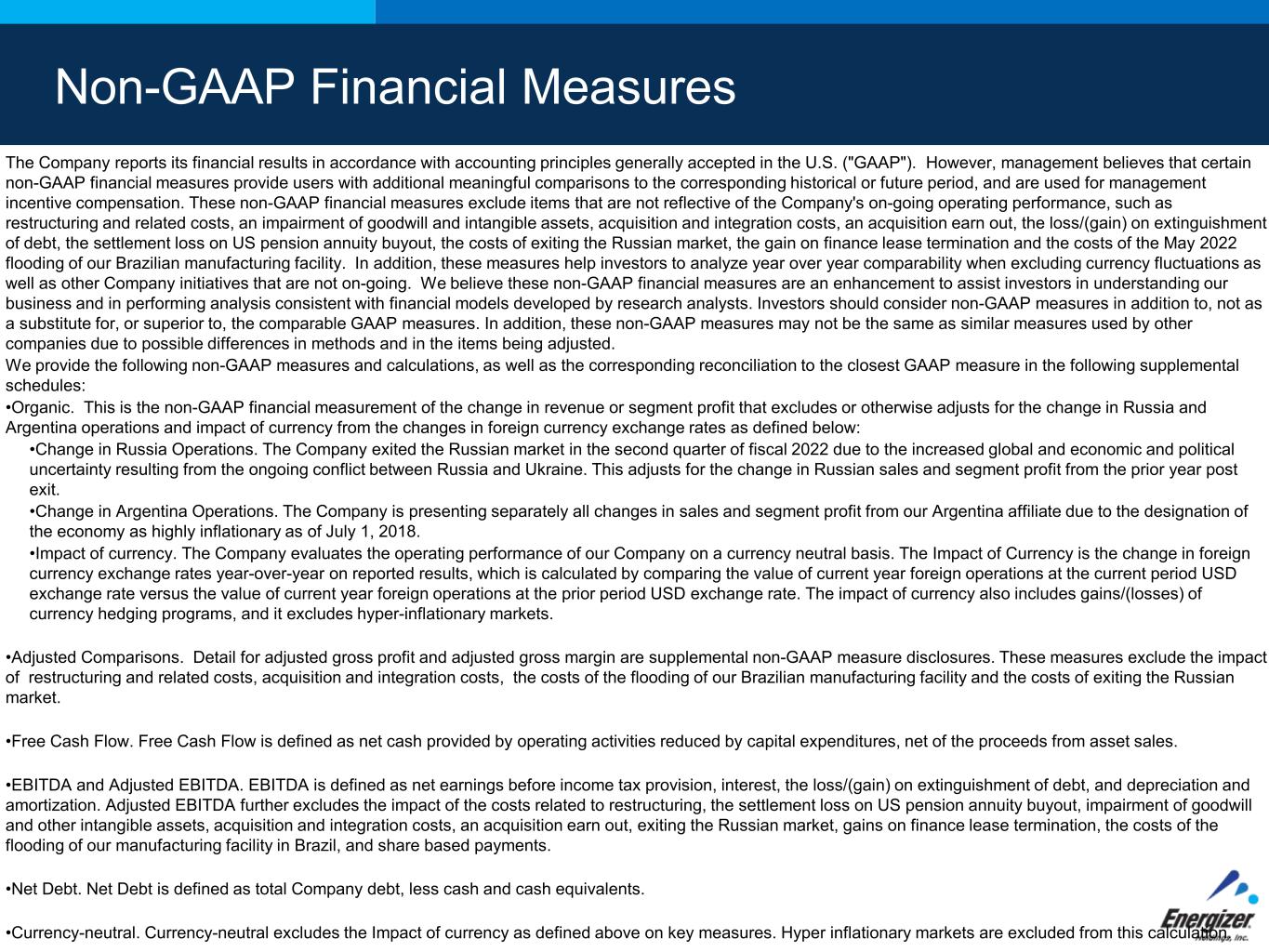 Non-GAAP Financial Measures The Company reports its financial results in accordance with accounting principles generally accepted in the U.S. ("GAAP"). However, management believes that certain non-GAAP financial measures provide users with additional meaningful comparisons to the corresponding historical or future period, and are used for management incentive compensation. These non-GAAP financial measures exclude items that are not reflective of the Company's on-going operating performance, such as restructuring and related costs, an impairment of goodwill and intangible assets, acquisition and integration costs, an acquisition earn out, the loss/(gain) on extinguishment of debt, the settlement loss on US pension annuity buyout, the costs of exiting the Russian market, the gain on finance lease termination and the costs of the May 2022 flooding of our Brazilian manufacturing facility. In addition, these measures help investors to analyze year over year comparability when excluding currency fluctuations as well as other Company initiatives that are not on-going. We believe these non-GAAP financial measures are an enhancement to assist investors in understanding our business and in performing analysis consistent with financial models developed by research analysts. Investors should consider non-GAAP measures in addition to, not as a substitute for, or superior to, the comparable GAAP measures. In addition, these non-GAAP measures may not be the same as similar measures used by other companies due to possible differences in methods and in the items being adjusted. We provide the following non-GAAP measures and calculations, as well as the corresponding reconciliation to the closest GAAP measure in the following supplemental schedules: •Organic. This is the non-GAAP financial measurement of the change in revenue or segment profit that excludes or otherwise adjusts for the change in Russia and Argentina operations and impact of currency from the changes in foreign currency exchange rates as defined below: •Change in Russia Operations. The Company exited the Russian market in the second quarter of fiscal 2022 due to the increased global and economic and political uncertainty resulting from the ongoing conflict between Russia and Ukraine. This adjusts for the change in Russian sales and segment profit from the prior year post exit. •Change in Argentina Operations. The Company is presenting separately all changes in sales and segment profit from our Argentina affiliate due to the designation of the economy as highly inflationary as of July 1, 2018. •Impact of currency. The Company evaluates the operating performance of our Company on a currency neutral basis. The Impact of Currency is the change in foreign currency exchange rates year-over-year on reported results, which is calculated by comparing the value of current year foreign operations at the current period USD exchange rate versus the value of current year foreign operations at the prior period USD exchange rate. The impact of currency also includes gains/(losses) of currency hedging programs, and it excludes hyper-inflationary markets. •Adjusted Comparisons. Detail for adjusted gross profit and adjusted gross margin are supplemental non-GAAP measure disclosures. These measures exclude the impact of restructuring and related costs, acquisition and integration costs, the costs of the flooding of our Brazilian manufacturing facility and the costs of exiting the Russian market. •Free Cash Flow. Free Cash Flow is defined as net cash provided by operating activities reduced by capital expenditures, net of the proceeds from asset sales. •EBITDA and Adjusted EBITDA. EBITDA is defined as net earnings before income tax provision, interest, the loss/(gain) on extinguishment of debt, and depreciation and amortization. Adjusted EBITDA further excludes the impact of the costs related to restructuring, the settlement loss on US pension annuity buyout, impairment of goodwill and other intangible assets, acquisition and integration costs, an acquisition earn out, exiting the Russian market, gains on finance lease termination, the costs of the flooding of our manufacturing facility in Brazil, and share based payments. •Net Debt. Net Debt is defined as total Company debt, less cash and cash equivalents. •Currency-neutral. Currency-neutral excludes the Impact of currency as defined above on key measures. Hyper inflationary markets are excluded from this calculation.