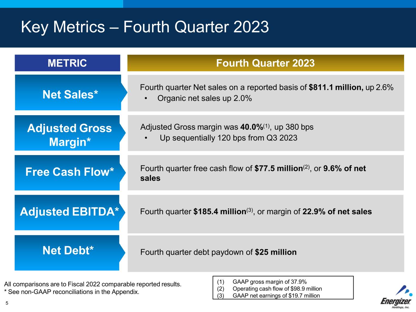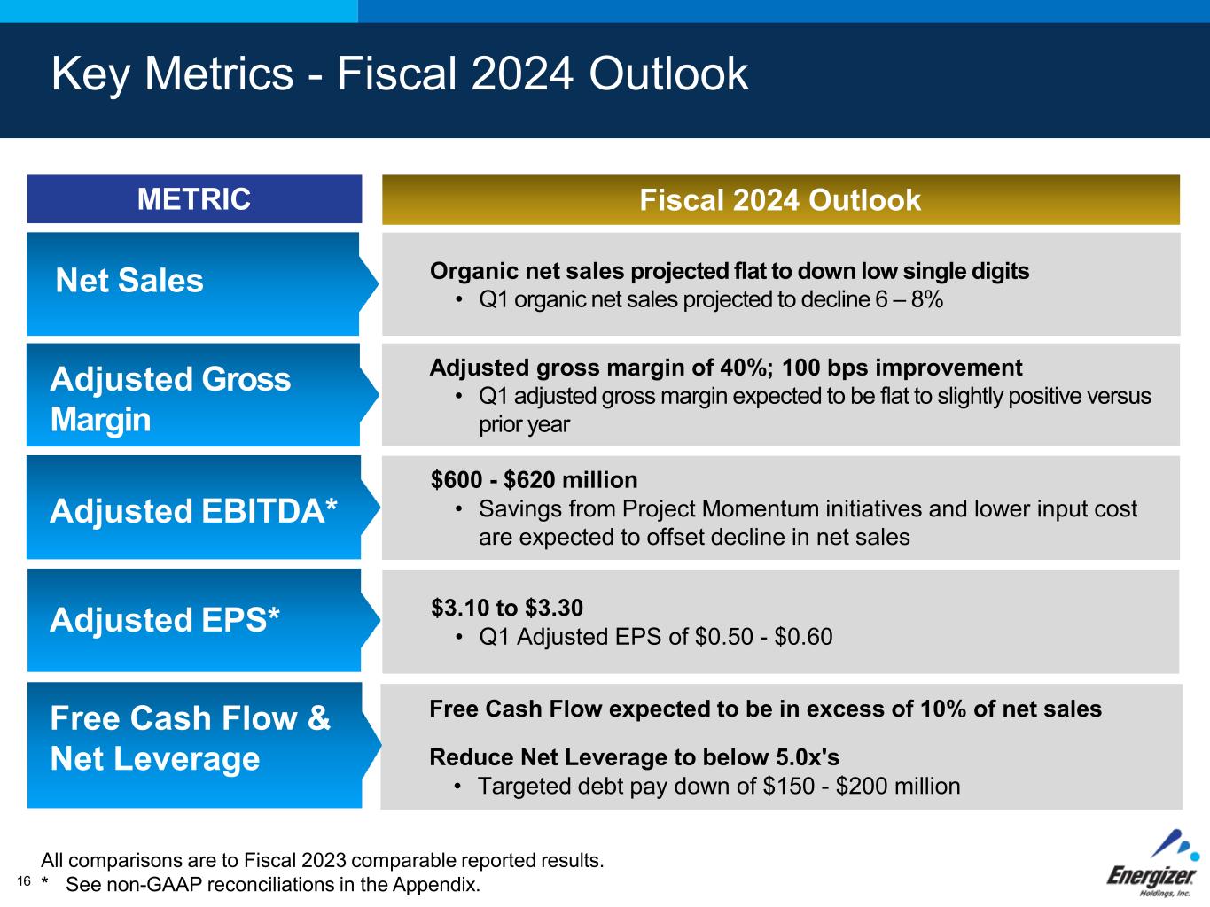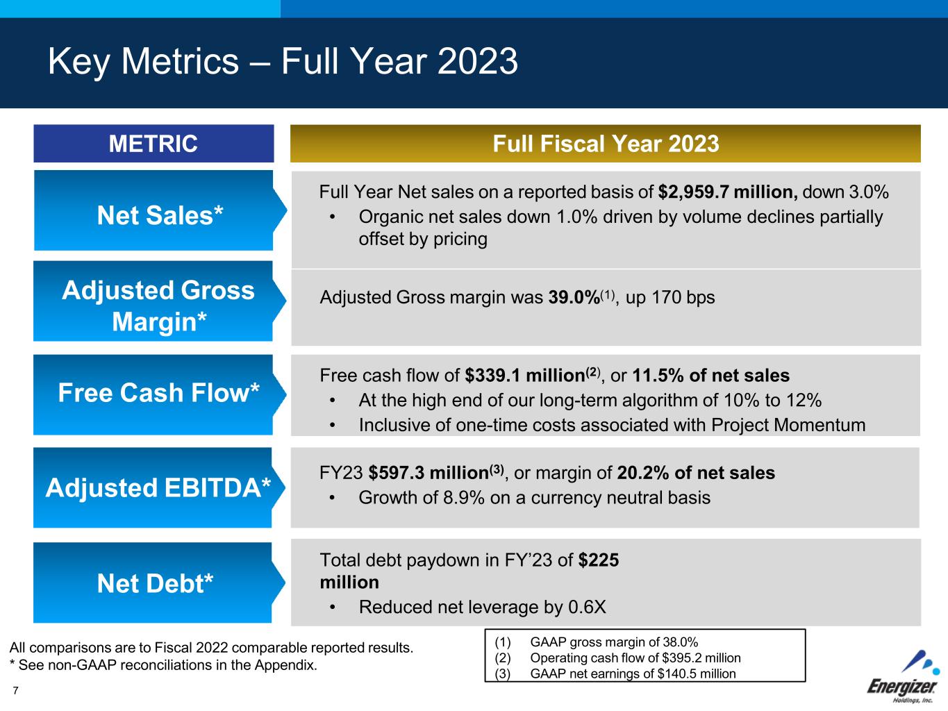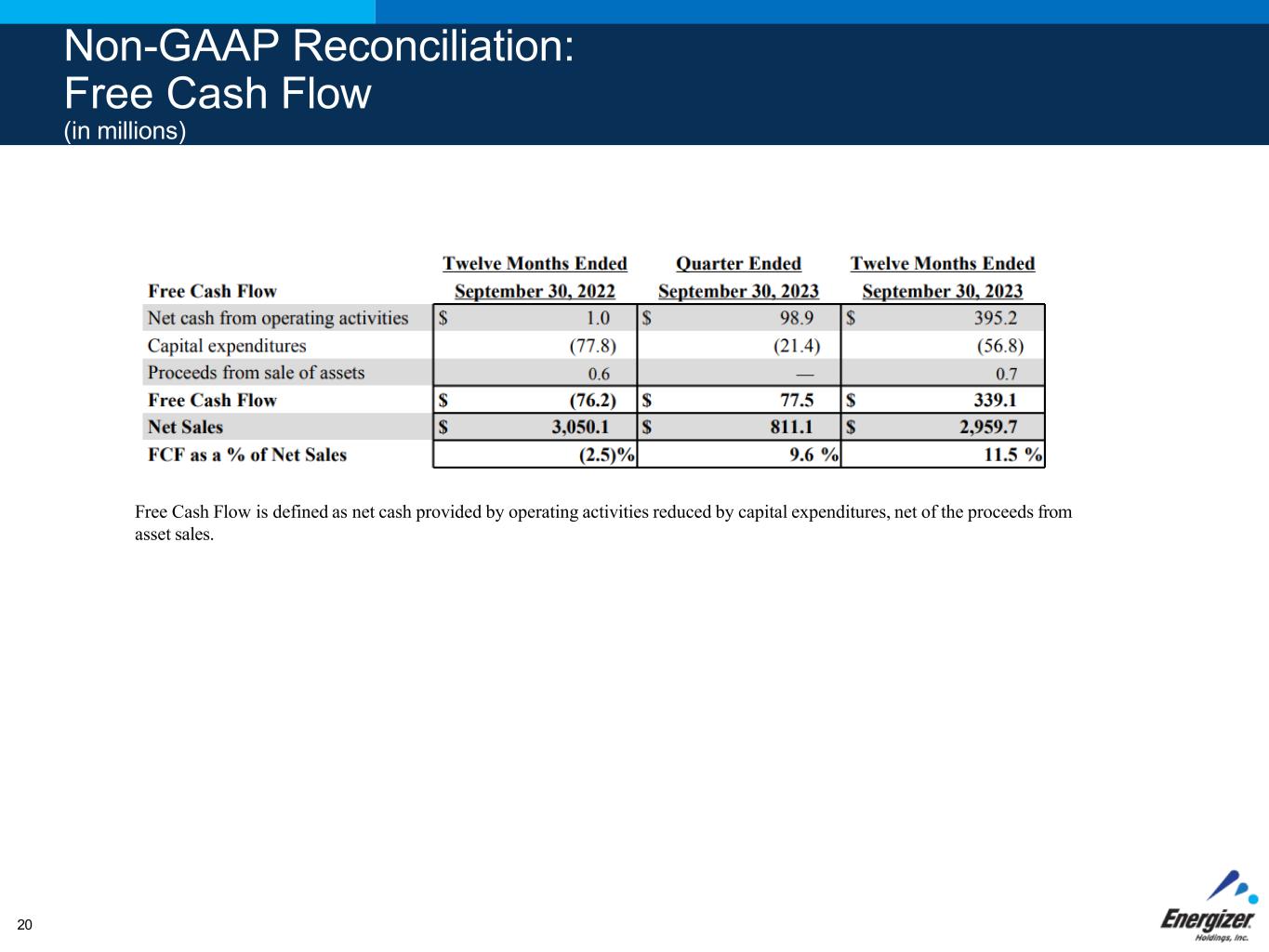Non-GAAP Financial Measures The Company reports its financial results in accordance with accounting principles generally accepted in the U.S. ("GAAP"). However, management believes that certain non-GAAP financial measures provide users with additional meaningful comparisons to the corresponding historical or future period, and are used for management incentive compensation. These non-GAAP financial measures exclude items that are not reflective of the Company's on-going operating performance, such as restructuring and related costs, an impairment of goodwill and intangible assets, acquisition and integration costs, an acquisition earn out, the loss/(gain) on extinguishment of debt, the settlement loss on US pension annuity buyout, the costs of exiting the Russian market, the gain on finance lease termination and the costs of the May 2022 flooding of our Brazilian manufacturing facility. In addition, these measures help investors to analyze year over year comparability when excluding currency fluctuations as well as other Company initiatives that are not on-going. We believe these non-GAAP financial measures are an enhancement to assist investors in understanding our business and in performing analysis consistent with financial models developed by research analysts. Investors should consider non-GAAP measures in addition to, not as a substitute for, or superior to, the comparable GAAP measures. In addition, these non-GAAP measures may not be the same as similar measures used by other companies due to possible differences in methods and in the items being adjusted. We provide the following non-GAAP measures and calculations, as well as the corresponding reconciliation to the closest GAAP measure in the following supplemental schedules: •Organic. This is the non-GAAP financial measurement of the change in revenue or segment profit that excludes or otherwise adjusts for the change in Russia and Argentina operations and impact of currency from the changes in foreign currency exchange rates as defined below: •Change in Russia Operations. The Company exited the Russian market in the second quarter of fiscal 2022 due to the increased global and economic and political uncertainty resulting from the ongoing conflict between Russia and Ukraine. This adjusts for the change in Russian sales and segment profit from the prior year post exit. •Change in Argentina Operations. The Company is presenting separately all changes in sales and segment profit from our Argentina affiliate due to the designation of the economy as highly inflationary as of July 1, 2018. •Impact of currency. The Company evaluates the operating performance of our Company on a currency neutral basis. The Impact of Currency is the change in foreign currency exchange rates year-over-year on reported results, which is calculated by comparing the value of current year foreign operations at the current period USD exchange rate versus the value of current year foreign operations at the prior period USD exchange rate. The impact of currency also includes gains/(losses) of currency hedging programs, and it excludes hyper-inflationary markets. •Adjusted Comparisons. Detail for adjusted gross profit and adjusted gross margin are supplemental non-GAAP measure disclosures. These measures exclude the impact of restructuring and related costs, acquisition and integration costs, the costs of the flooding of our Brazilian manufacturing facility and the costs of exiting the Russian market. •Free Cash Flow. Free Cash Flow is defined as net cash provided by operating activities reduced by capital expenditures, net of the proceeds from asset sales. •EBITDA and Adjusted EBITDA. EBITDA is defined as net earnings before income tax provision, interest, the loss/(gain) on extinguishment of debt, and depreciation and amortization. Adjusted EBITDA further excludes the impact of the costs related to restructuring, the settlement loss on US pension annuity buyout, impairment of goodwill and other intangible assets, acquisition and integration costs, an acquisition earn out, exiting the Russian market, gains on finance lease termination, the costs of the flooding of our manufacturing facility in Brazil, and share based payments. •Net Debt. Net Debt is defined as total Company debt, less cash and cash equivalents. •Currency-neutral. Currency-neutral excludes the Impact of currency as defined above on key measures. Hyper inflationary markets are excluded from this calculation.