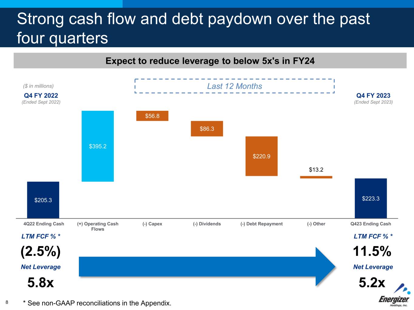 METRIC Full Fiscal Year 2023 Free Cash Flow* Adjusted Gross Margin* FY23 $597.3 million(3), or margin of 20.2% of net sales • Growth of 8.9% on a currency neutral basis Adjusted Gross margin was 39.0%(1), up 170 bps All comparisons are to Fiscal 2022 comparable reported results. * See non-GAAP reconciliations in the Appendix. Adjusted EBITDA* Free cash flow of $339.1 million(2), or 11.5% of net sales • At the high end of our long-term algorithm of 10% to 12% • Inclusive of one-time costs associated with Project Momentum Key Metrics – Full Year 2023 Net Sales* Full Year Net sales on a reported basis of $2,959.7 million, down 3.0% • Organic net sales down 1.0% driven by volume declines partially offset by pricing (1) GAAP gross margin of 38.0% (2) Operating cash flow of $395.2 million (3) GAAP net earnings of $140.5 million Net Debt* Total debt paydown in FY’23 of $225 million • Reduced net leverage by 0.6X 7
