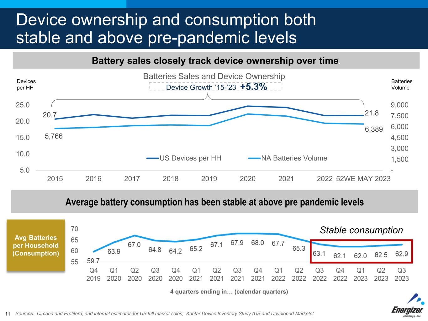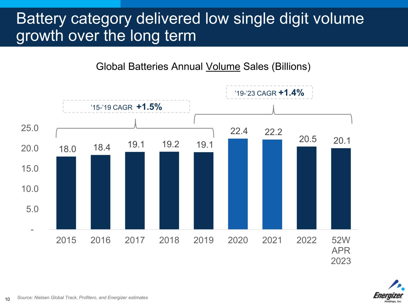 Battery category delivered low single digit volume growth over the long term ’15-’19 CAGR +1.5% 18.0 18.4 19.1 19.2 19.1 22.4 22.2 20.5 20.1 - 5.0 10.0 15.0 20.0 25.0 2015 2016 2017 2018 2019 2020 2021 2022 52W APR 2023 Global Batteries Annual Volume Sales (Billions) ’19-’23 CAGR +1.4% Source: Nielsen Global Track, Profitero, and Energizer estimates10