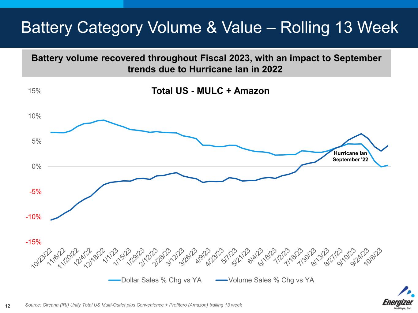 Battery Category Volume & Value – Rolling 13 Week Source: Circana (IRI) Unify Total US Multi-Outlet plus Convenience + Profitero (Amazon) trailing 13 week -15% -10% -5% 0% 5% 10% 15% Dollar Sales % Chg vs YA Volume Sales % Chg vs YA Hurricane Ian September '22 Battery volume recovered throughout Fiscal 2023, with an impact to September trends due to Hurricane Ian in 2022 Total US - MULC + Amazon 12
