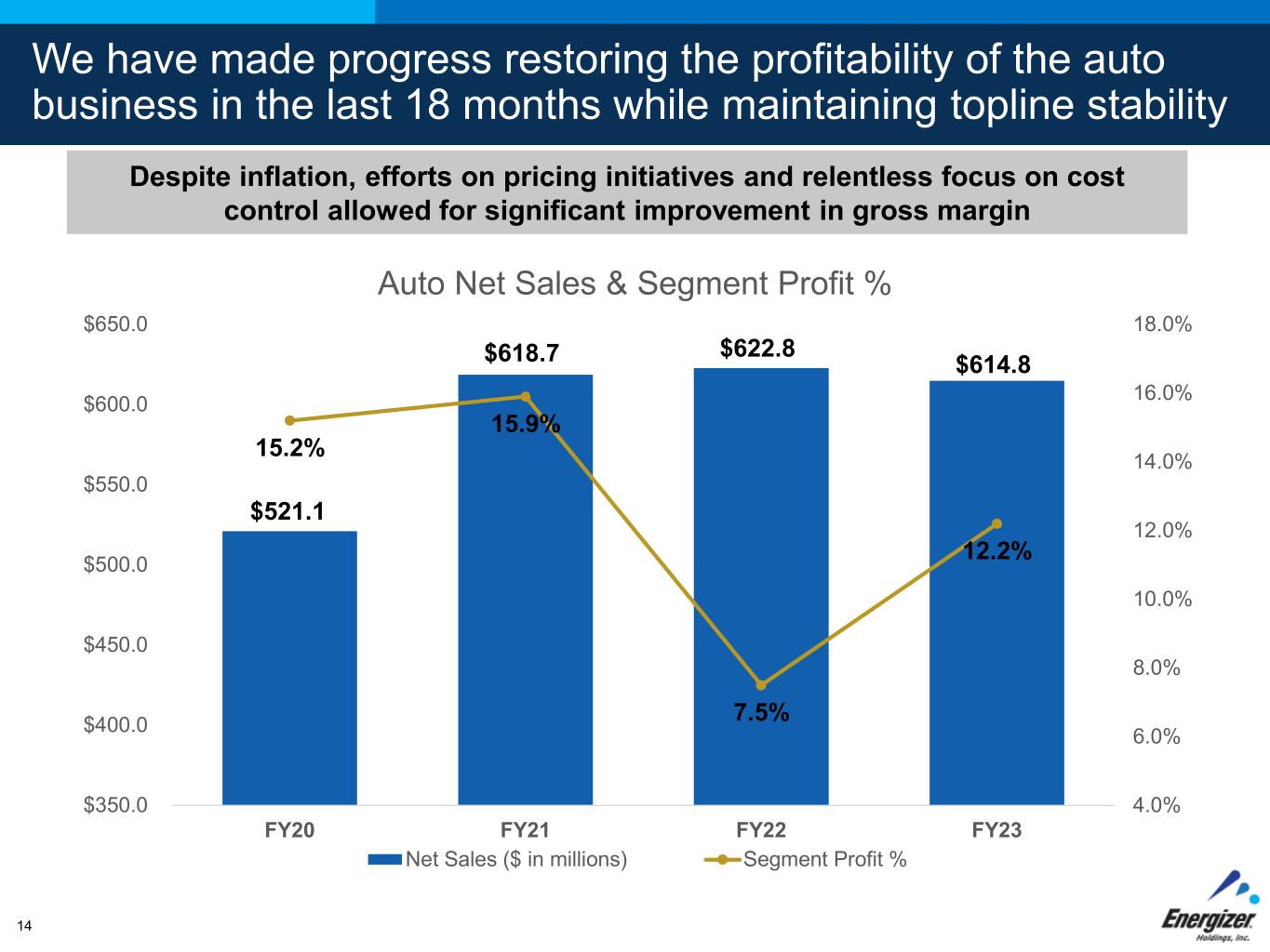 $521.1 $618.7 $622.8 $614.8 15.2% 15.9% 7.5% 12.2% 4.0% 6.0% 8.0% 10.0% 12.0% 14.0% 16.0% 18.0% $350.0 $400.0 $450.0 $500.0 $550.0 $600.0 $650.0 FY20 FY21 FY22 FY23 Auto Net Sales & Segment Profit % Net Sales ($ in millions) Segment Profit % We have made progress restoring the profitability of the auto business in the last 18 months while maintaining topline stability 14 Despite inflation, efforts on pricing initiatives and relentless focus on cost control allowed for significant improvement in gross margin