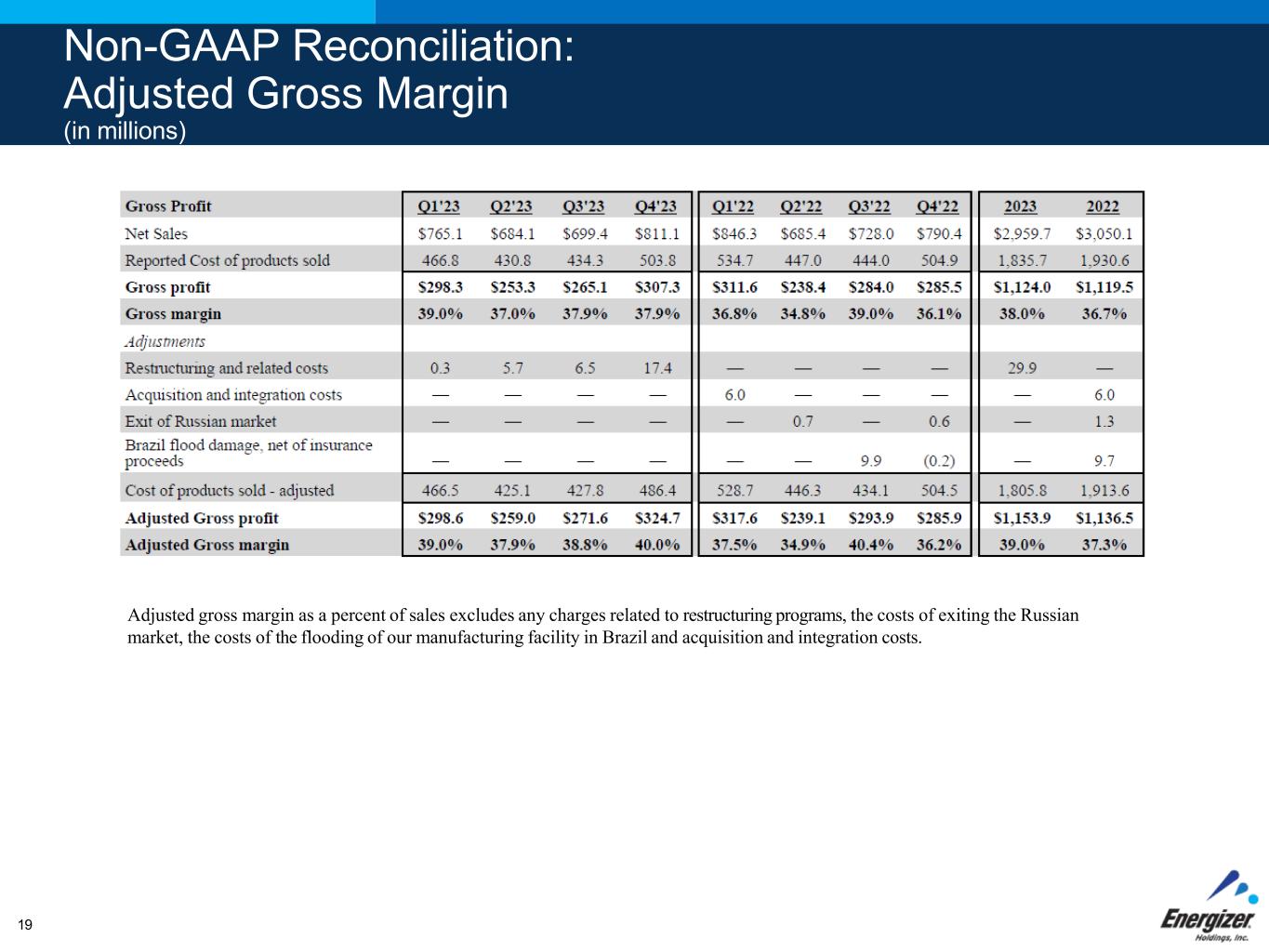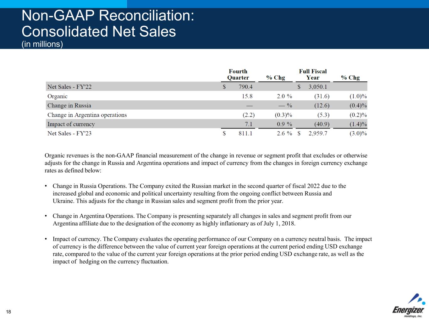 Non-GAAP Reconciliation: Consolidated Net Sales (in millions) Organic revenues is the non-GAAP financial measurement of the change in revenue or segment profit that excludes or otherwise adjusts for the change in Russia and Argentina operations and impact of currency from the changes in foreign currency exchange rates as defined below: • Change in Russia Operations. The Company exited the Russian market in the second quarter of fiscal 2022 due to the increased global and economic and political uncertainty resulting from the ongoing conflict between Russia and Ukraine. This adjusts for the change in Russian sales and segment profit from the prior year. • Change in Argentina Operations. The Company is presenting separately all changes in sales and segment profit from our Argentina affiliate due to the designation of the economy as highly inflationary as of July 1, 2018. • Impact of currency. The Company evaluates the operating performance of our Company on a currency neutral basis. The impact of currency is the difference between the value of current year foreign operations at the current period ending USD exchange rate, compared to the value of the current year foreign operations at the prior period ending USD exchange rate, as well as the impact of hedging on the currency fluctuation. 18